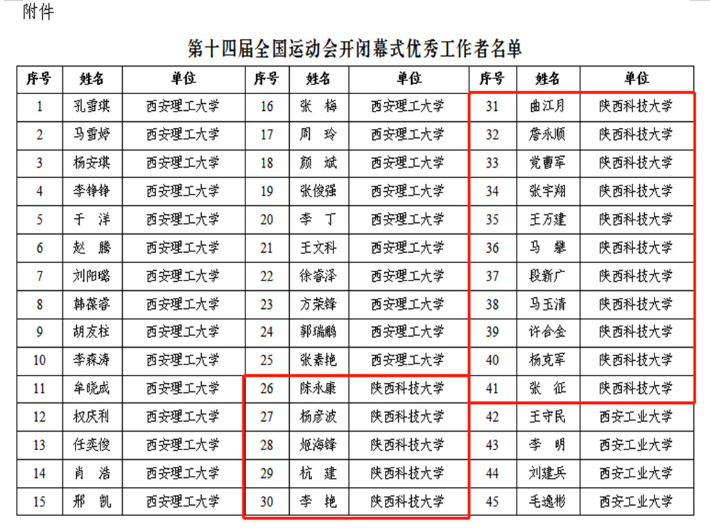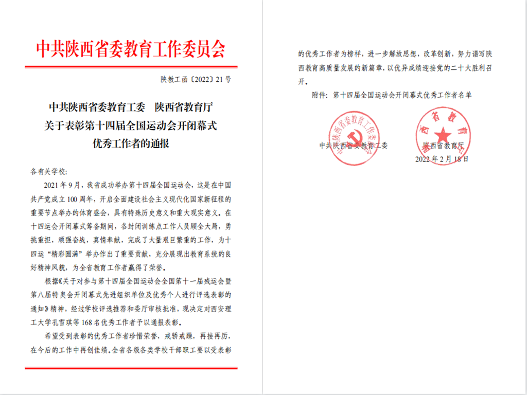 近日,中共陜西省委教育工委、陜西省教育廳對(duì)第十四屆全國(guó)運(yùn)動(dòng)會(huì)開(kāi)閉幕式服務(wù)保障的優(yōu)秀個(gè)人進(jìn)行評(píng)選表彰,我校陳永康等16名教師獲“優(yōu)秀工作者”榮譽(yù)稱(chēng)號(hào)。