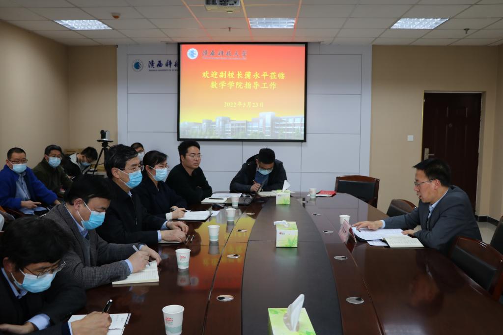 3月23日下午,數(shù)學(xué)與數(shù)據(jù)科學(xué)學(xué)院在理科樓441會(huì)議室召開數(shù)學(xué)學(xué)科建設(shè)推進(jìn)會(huì)。副校長(zhǎng)蒲永平到會(huì)指導(dǎo),數(shù)學(xué)學(xué)院班子成員、2016年至今入職的全體博士參加會(huì)議。會(huì)議由數(shù)學(xué)學(xué)院院長(zhǎng)李劍主持。