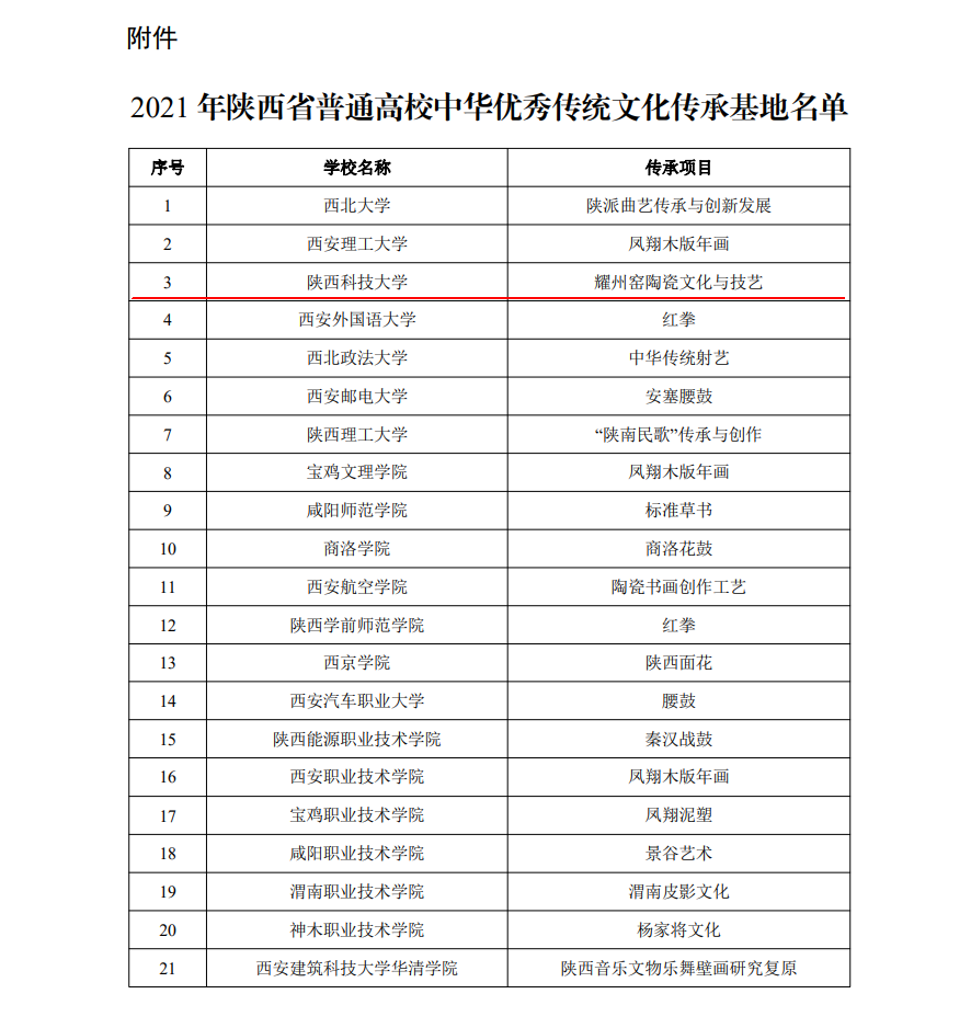 近日陜西省教育廳公布了2021年陜西省普通高校中華優(yōu)秀傳統(tǒng)文化傳承基地名單。經(jīng)全省各高校自主申報(bào)、 省教育廳組織專家遴選與公示,由校長李志健主管、科技處組織、設(shè)計(jì)與藝術(shù)學(xué)院牽頭申報(bào)的“耀州窯陶瓷文化與技藝”傳承項(xiàng)目,作為此次全省遴選認(rèn)定的21個(gè)基地之一,成功入選。
