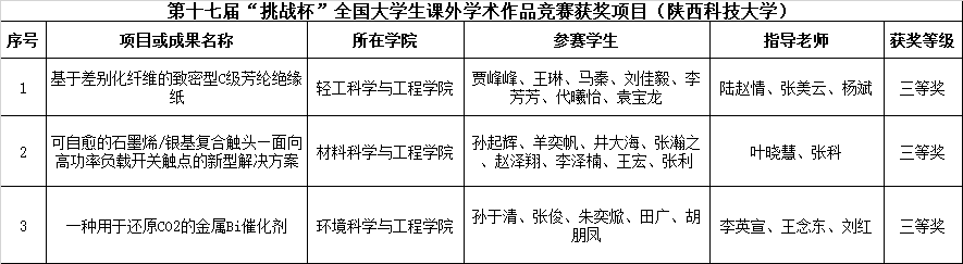 “挑戰(zhàn)杯”全國大學(xué)生課外學(xué)術(shù)科技作品競賽被譽為中國大學(xué)生科技創(chuàng)新創(chuàng)業(yè)的“奧林匹克”盛會,是目前國內(nèi)最具代表性、權(quán)威性、示范性、導(dǎo)向性的大學(xué)生競賽之一。本屆賽事共有來自全國2000余所高校青年學(xué)生的踴躍參與,其中我校獲得全國三等獎的作品分別為輕工科學(xué)與工程學(xué)院《基于差別化纖維的致密型C級芳綸絕緣紙》、材料科學(xué)與工程學(xué)院《可自愈的石墨烯/銀基復(fù)合觸頭—面向高功率負載開關(guān)觸點的新型解決方案》、環(huán)境科學(xué)與工程學(xué)院《一種用于還原CO2的金屬Bi催化劑》。