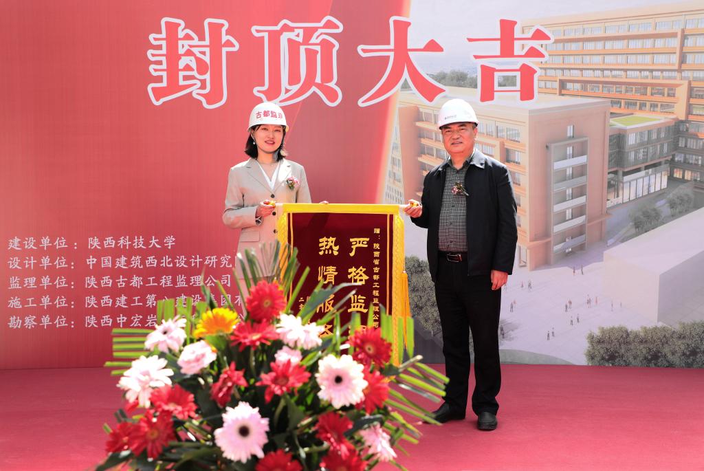 校黨委副書記楊欲曉(右)向監(jiān)理單位代表頒發(fā)錦旗