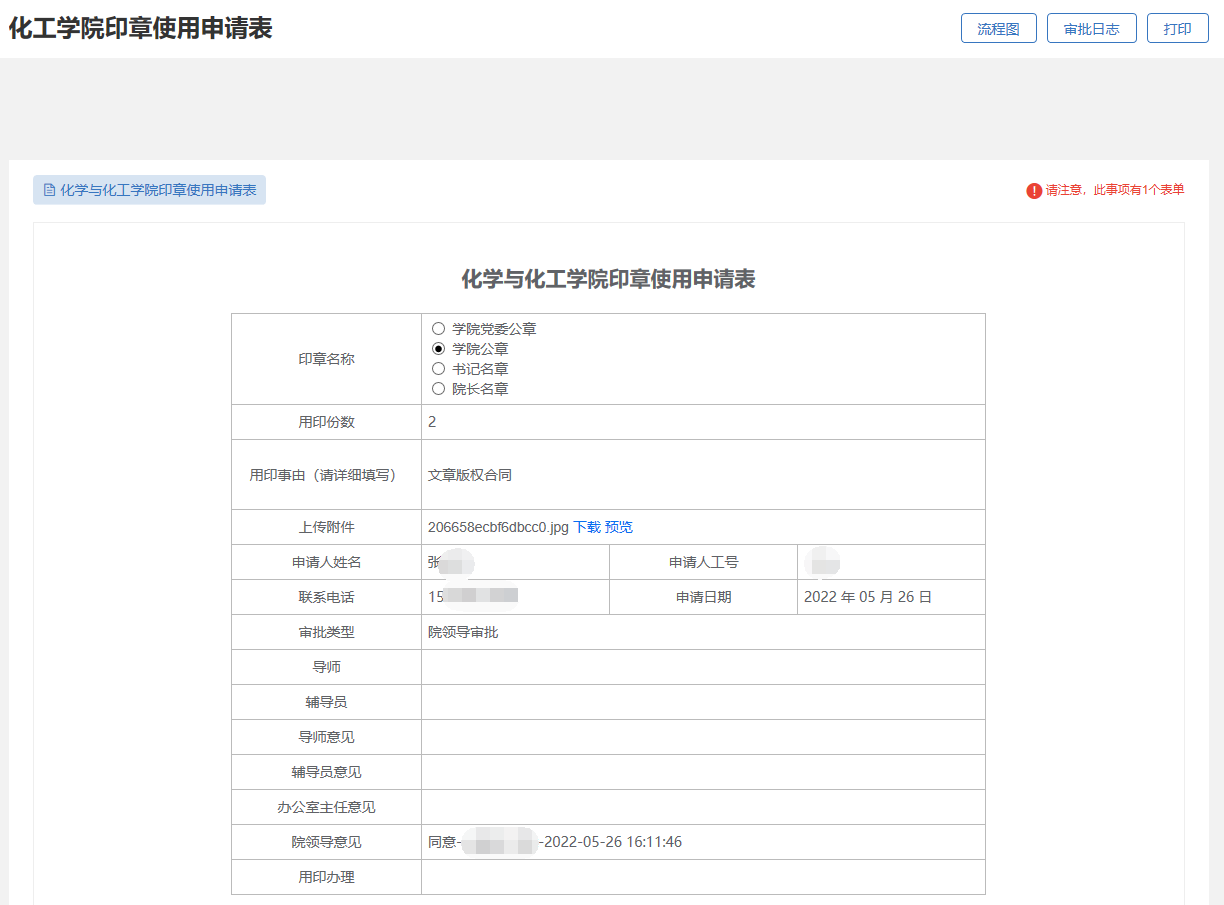 2021年4月,信息與網(wǎng)絡管理中心按照化學與化工學院提出的網(wǎng)上用印流程建設需求,經(jīng)過前期溝通、過程梳理、建設、測試等環(huán)節(jié),于次月在“網(wǎng)上辦事大廳”上線“化學與化工學院印章使用申請”,上線一年時間,申請用印數(shù)量達到558項,平均用時0.6天,最短用時1分鐘,師生辦事效率、學院管理效率均得到極大提升。