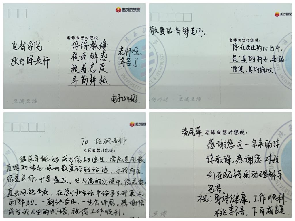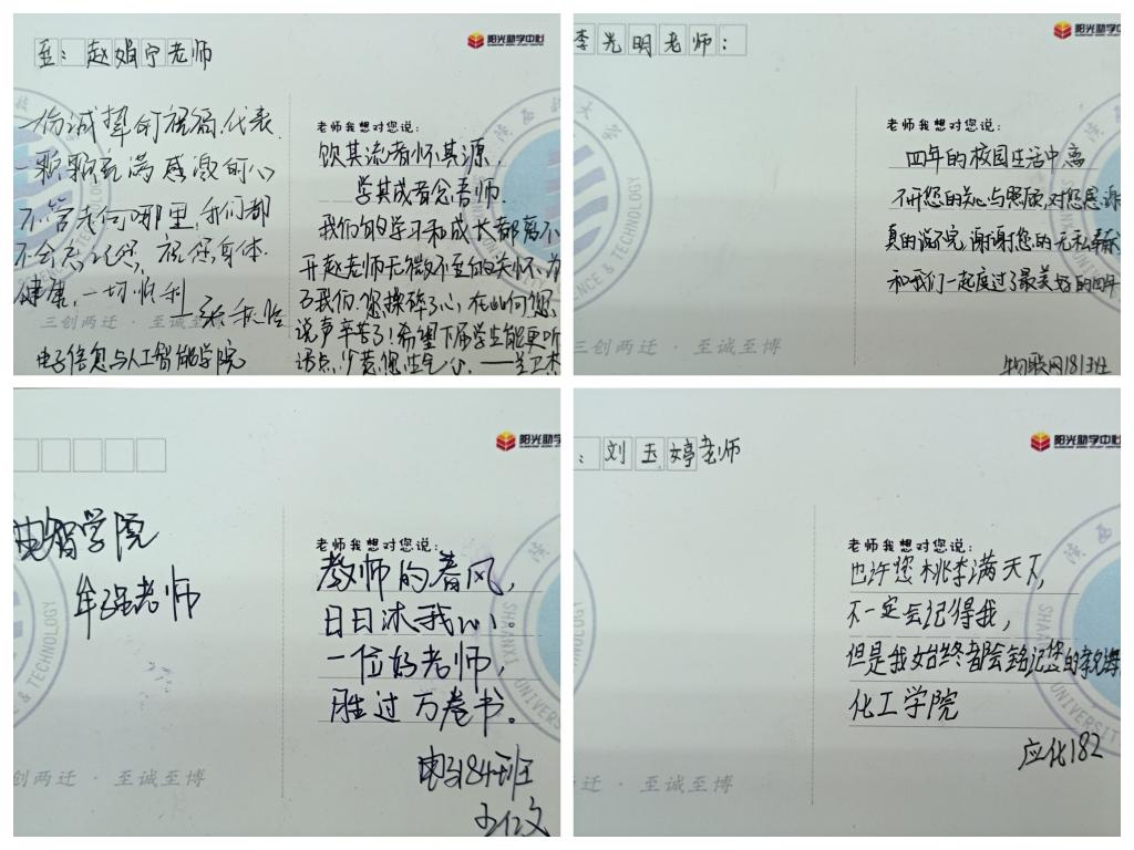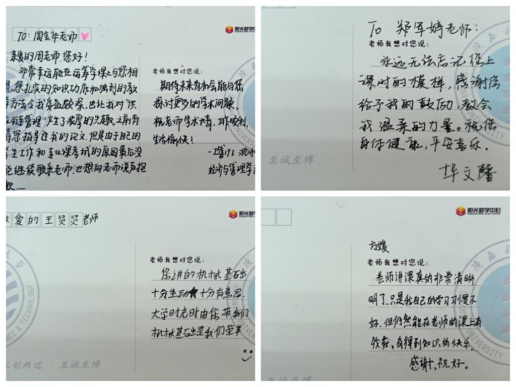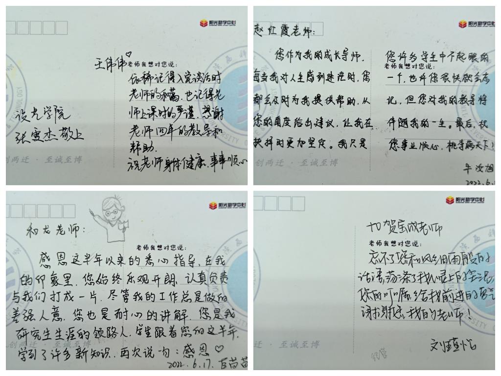 為引導(dǎo)學(xué)生感念師恩、禮敬教師,營造尊師重教良好氛圍,黨委教師工作部、校團委聯(lián)合開展“至誠至博,師恩難忘——親愛的老師,我想對您說”活動。邀請2022屆畢業(yè)生為喜愛的老師手寫明信片,留下感恩和祝福。部分學(xué)生手寫祝福及寄語選登如下∶
