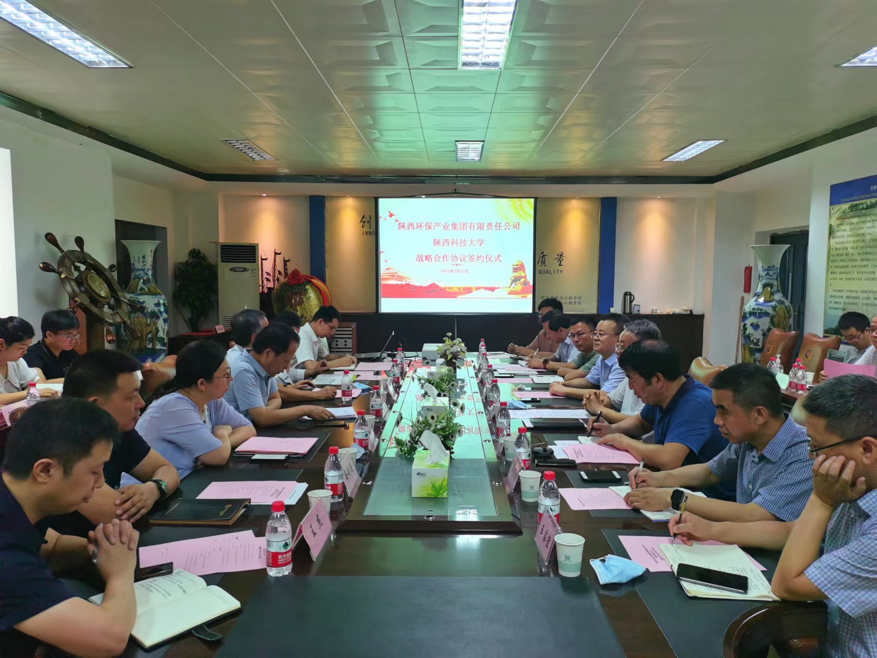 為積極參與陜西省“秦創(chuàng)原”創(chuàng)新驅(qū)動(dòng)平臺(tái)建設(shè),進(jìn)一步構(gòu)建“以企業(yè)為中心、高校圍繞市場(chǎng)需求開展科研活動(dòng)”校企合作新模式,7月12日,我校與陜西環(huán)保產(chǎn)業(yè)集團(tuán)戰(zhàn)略合作協(xié)議簽訂儀式在我校環(huán)境科學(xué)與工程學(xué)院會(huì)議室舉行,校黨委副書記、紀(jì)委書記、監(jiān)察專員王為民出席簽約儀式。陜西環(huán)保產(chǎn)業(yè)集團(tuán)黨委副書記、董事、總經(jīng)理顧峰,總工程師顏昊及集團(tuán)下屬部門、子公司負(fù)責(zé)人等12人,環(huán)境學(xué)院班子成員、各科研團(tuán)隊(duì)負(fù)責(zé)人及教師代表參加簽約儀式。會(huì)議由環(huán)境學(xué)院黨委書記李廣明主持。