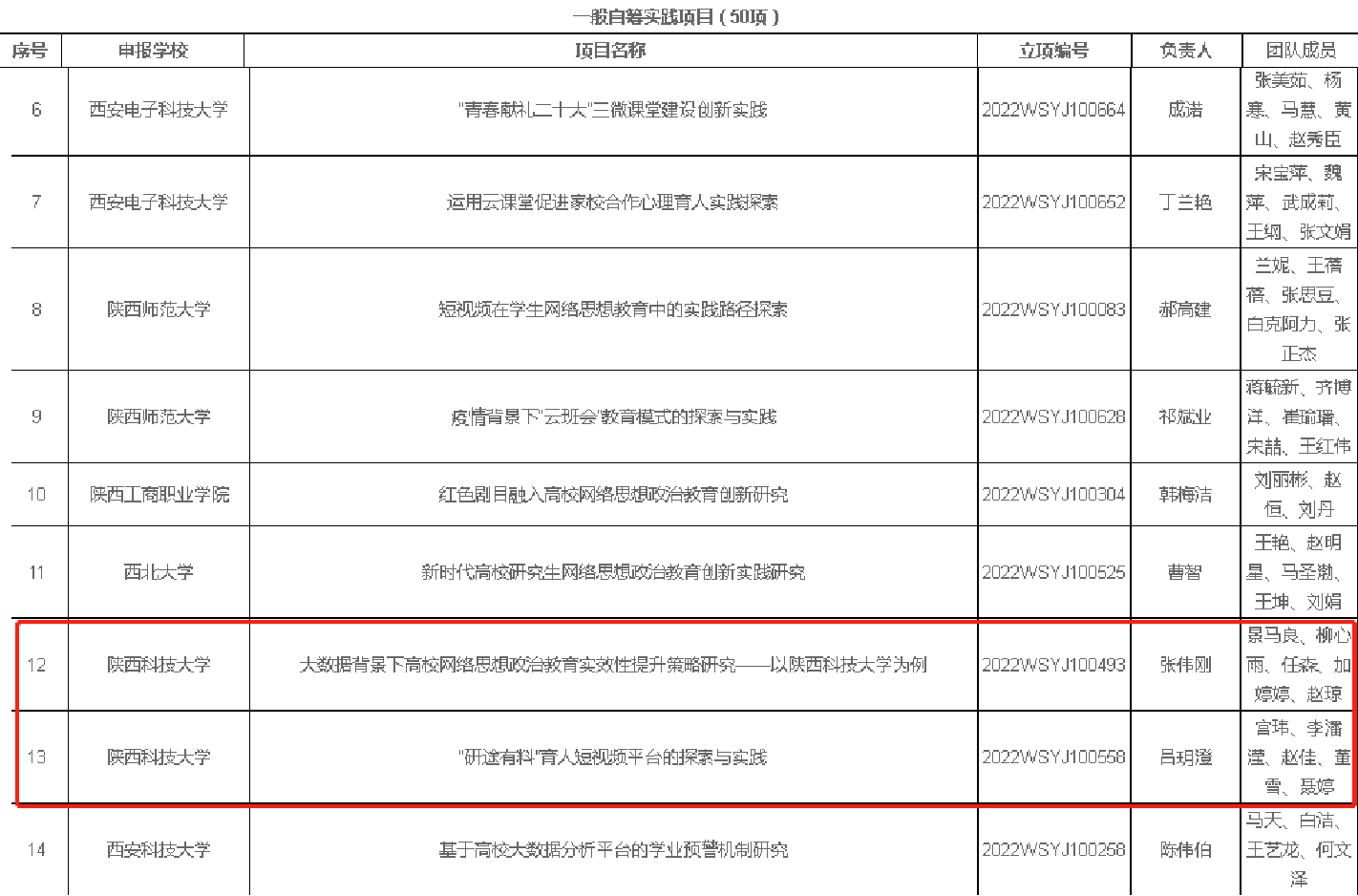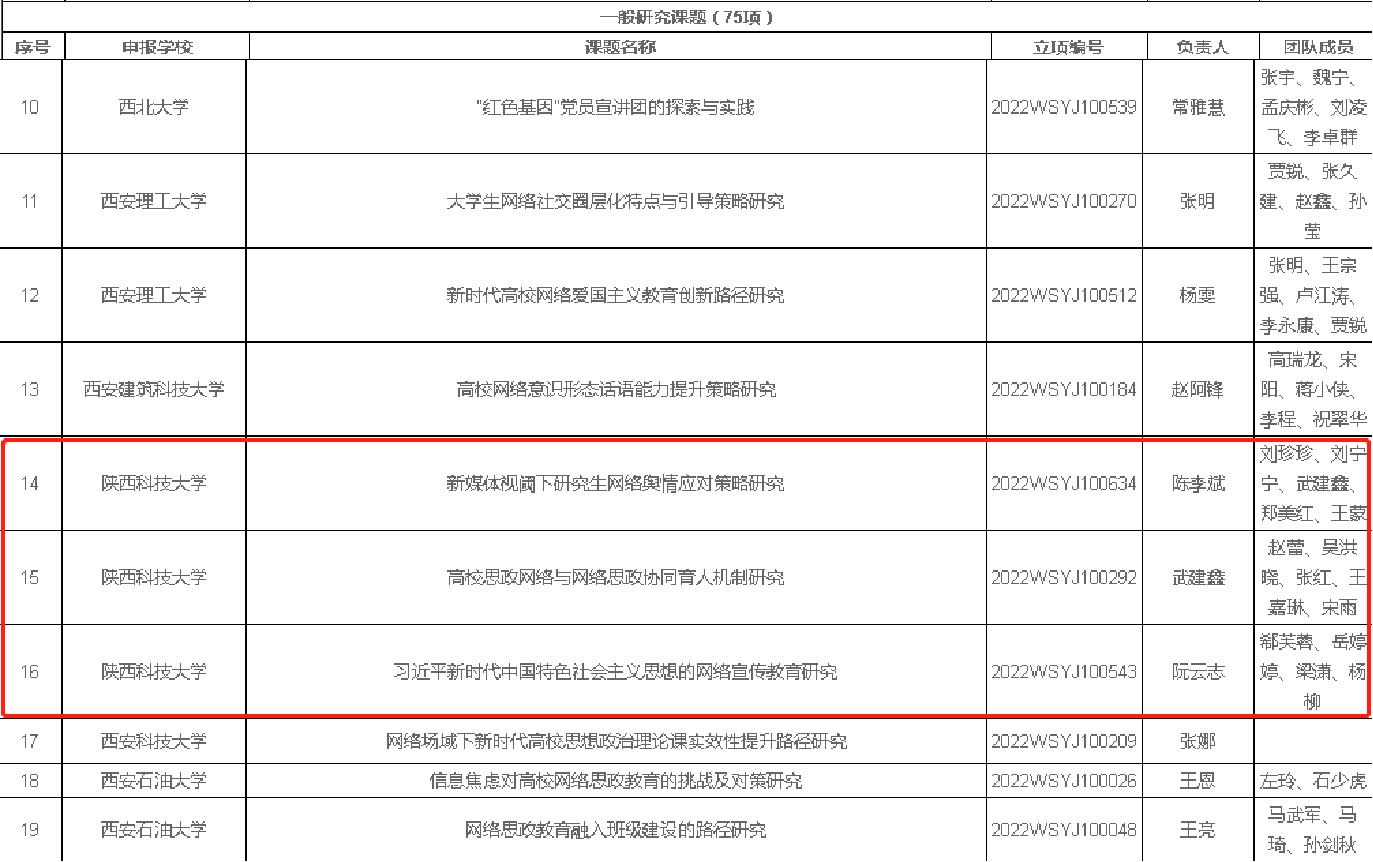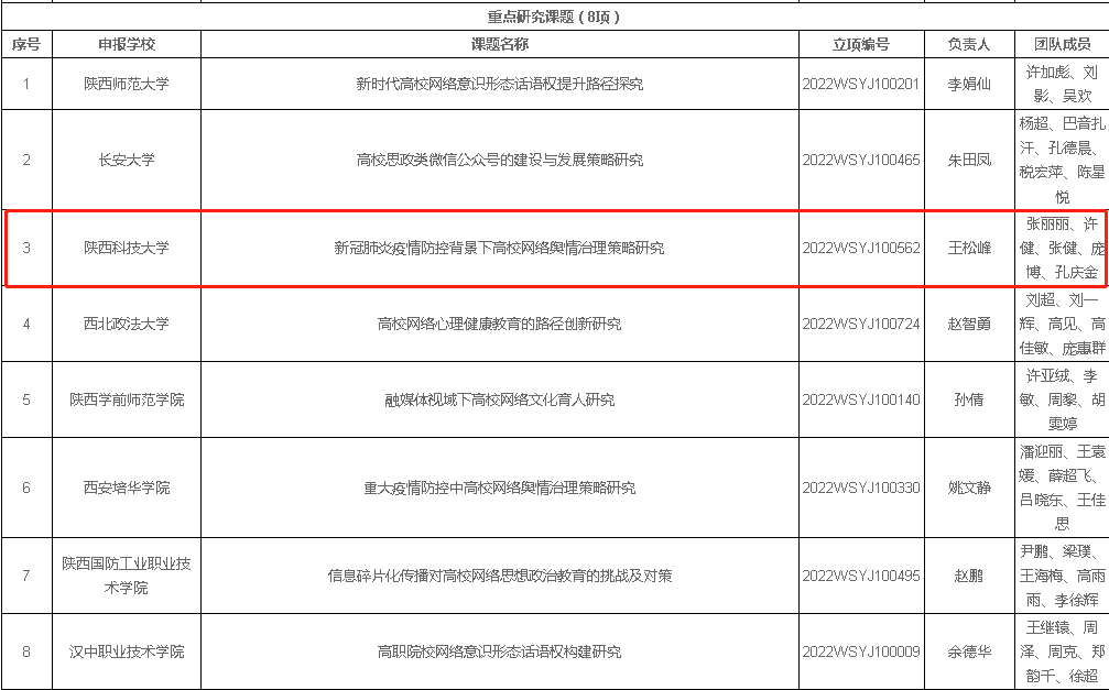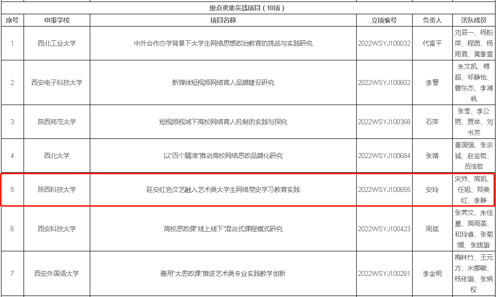 7月11日,陜西省委教育工委、陜西省教育廳對(duì)第二批陜西高校網(wǎng)絡(luò)思想政治工作研究課題與實(shí)踐項(xiàng)目立項(xiàng)結(jié)果進(jìn)行公示,我校獲批重點(diǎn)研究課題1項(xiàng),一般研究課題3項(xiàng),重點(diǎn)資助實(shí)踐項(xiàng)目1項(xiàng),一般自籌實(shí)踐項(xiàng)目2項(xiàng)。