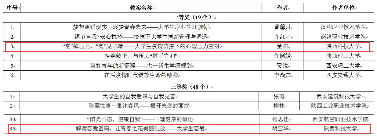 學(xué)工部心理中心教師董陽(yáng)的心理教案《“宅”掉壓力,“寓”見(jiàn)心晴——大學(xué)生疫情防控下的心理壓力應(yīng)對(duì)》榮獲第四屆陜西高校心理健康教育優(yōu)秀教案一等獎(jiǎng),該作品聚焦疫情防控背景下大學(xué)生產(chǎn)生的心理壓力感受,幫助學(xué)生積極調(diào)整、科學(xué)應(yīng)對(duì),健康自信的學(xué)習(xí)和生活。電子信息與人工智能學(xué)院輔導(dǎo)員胡亞華的心理教案《解讀戀愛(ài)密碼,讓青春之花美麗綻放——大學(xué)生戀愛(ài)》榮獲三等獎(jiǎng),該作品通過(guò)分析大學(xué)生的戀愛(ài)特點(diǎn)、戀愛(ài)類(lèi)型,引導(dǎo)大學(xué)生樹(shù)立科學(xué)的戀愛(ài)價(jià)值觀,綻放美麗青春。