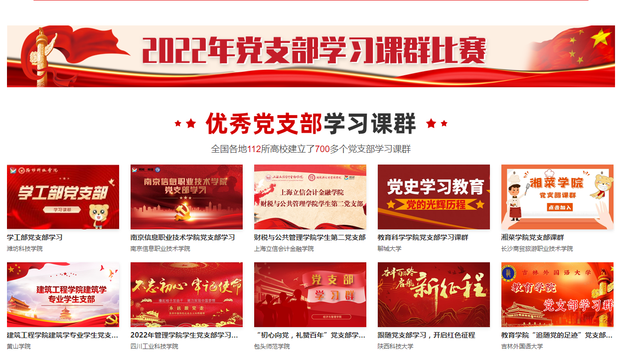 全國各地共計(jì)519所高校建立了黨建學(xué)習(xí)課群8500多個,112所高校建立了黨支部學(xué)習(xí)課群700多個,累計(jì)超過513萬大學(xué)生參與學(xué)習(xí)。我校共上報(bào)參賽課群8個,其中黨建課群5個,黨支部課群3個。課群涵蓋思想理論教育、黨性教育、黨的路線方針政策教育、業(yè)務(wù)知識教育等多個方面,涉及課程、考試、作業(yè)等多個版塊,靈活運(yùn)用視頻、音頻、漫畫等多種形式,在增強(qiáng)學(xué)生理論素養(yǎng)的同時極大程度激發(fā)學(xué)生愛黨愛國熱情,教育效果明顯,活躍度穩(wěn)居全國參賽課程前列,最終在兩項(xiàng)比賽中斬獲優(yōu)秀組織獎。