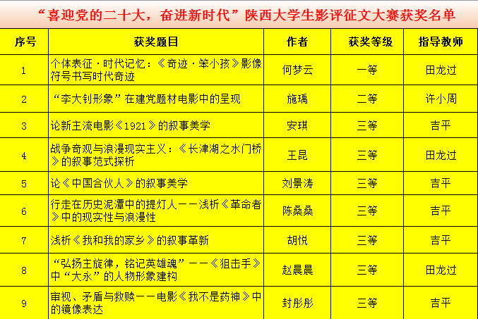 “喜迎黨的二十大,奮進(jìn)新時代”陜西大學(xué)生影評征文大賽由陜西省文學(xué)藝術(shù)界聯(lián)合會主辦、陜西省電影家協(xié)會承辦,2022年5月份開始征集作品。大賽根據(jù)參賽作品水準(zhǔn),先由初評委員會推選100篇入圍作品,再由終評委員會最終評定優(yōu)勝者。本屆大賽共吸引了西安交通大學(xué)、西北大學(xué)、陜西師范大學(xué)、長安大學(xué)、西安建筑科技大學(xué)、陜西科技大學(xué)、西安外國語大學(xué)等在內(nèi)的省內(nèi)二十多所高校,一千余名學(xué)子參加,大賽共評選出一等獎3項、二等獎10項、三等獎30項,入圍獎50項。