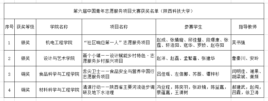 附:第六屆中國青年志愿服務(wù)項(xiàng)目大賽獲獎名單(陜西科技大學(xué))
