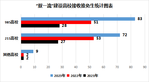 積極拓寬推薦本校優(yōu)秀本科生到“雙一流”建設(shè)高校免試攻讀碩士學(xué)位工作,2023年“雙一流”建設(shè)高校推薦占比接近全校推免計(jì)劃的70%。2023年學(xué)校有164名優(yōu)秀應(yīng)屆本科畢業(yè)生被推薦到“雙一流”建設(shè)高校攻讀研究生(含直博生5名),其中有83名推免生被北京大學(xué)、浙江大學(xué)、中國(guó)科學(xué)技術(shù)大學(xué)等23所985高校接收,72名推免生被29所211高校接收,學(xué)校推免生校外推薦數(shù)量和高校質(zhì)量不斷提升。