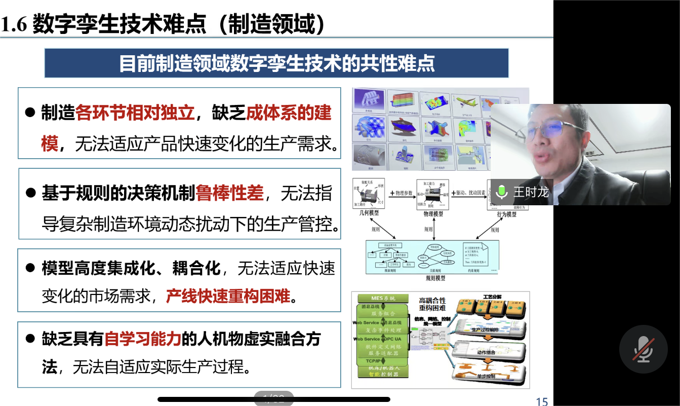 王時龍?jiān)趫蟾嬷兄赋?,智能制造是新一代人工智能技術(shù)與先進(jìn)制造技術(shù)的深度融合,是新一輪工業(yè)革命的核心驅(qū)動力,而數(shù)字孿生和人機(jī)物虛實(shí)融合技術(shù)在制造領(lǐng)域得到了廣泛應(yīng)用。王時龍就數(shù)字孿生技術(shù)的定義、原型、應(yīng)用、發(fā)展歷程、關(guān)鍵技術(shù)等多個方面進(jìn)行了詳細(xì)的講解。結(jié)合實(shí)際案例,針對產(chǎn)品訂單變化、實(shí)時生產(chǎn)狀態(tài)等,采用數(shù)字孿生和人機(jī)物虛實(shí)融合技術(shù)對自動化生產(chǎn)線進(jìn)行自適應(yīng)重構(gòu)。王時龍還介紹了其團(tuán)隊(duì)在數(shù)字孿生方面的重大研究成果。