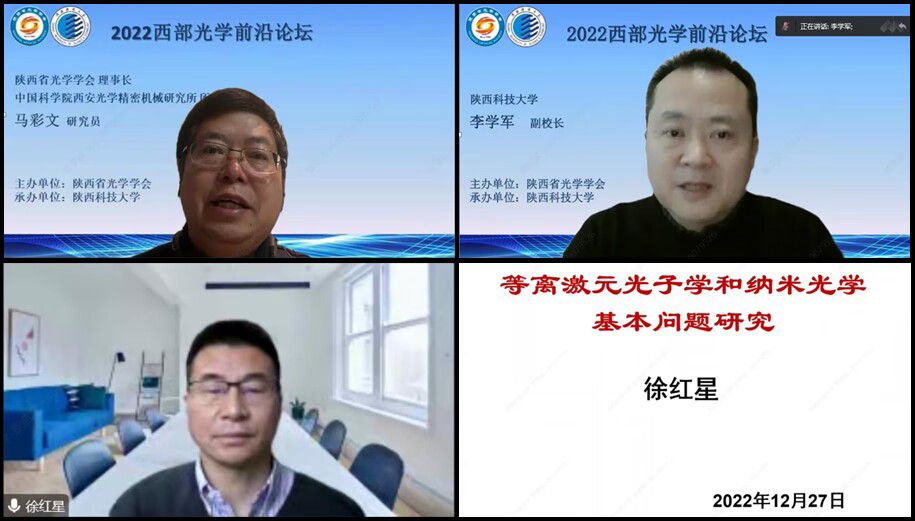 12月26日至27日,由陜西省光學(xué)學(xué)會主辦、陜西科技大學(xué)承辦的“2022年西部光學(xué)前沿論壇”在線上舉行。陜西省光學(xué)學(xué)會理事長、中國科學(xué)院西安光學(xué)精密機械研究所所長馬彩文研究員,我校副校長李學(xué)軍出席會議并致辭。中國科學(xué)院院士、武漢大學(xué)徐紅星教授,國家杰出青年基金獲得者、中國科學(xué)院物理研究所魏志義研究員,國家杰出青年基金獲得者、北京大學(xué)肖云峰教授,國家杰出青年基金獲得者、中國科學(xué)技術(shù)大學(xué)史保森教授,國家杰出青年基金獲得者、中國科學(xué)技術(shù)大學(xué)姜海峰教授等省內(nèi)外130多名專家、學(xué)者應(yīng)邀參加了本次論壇。