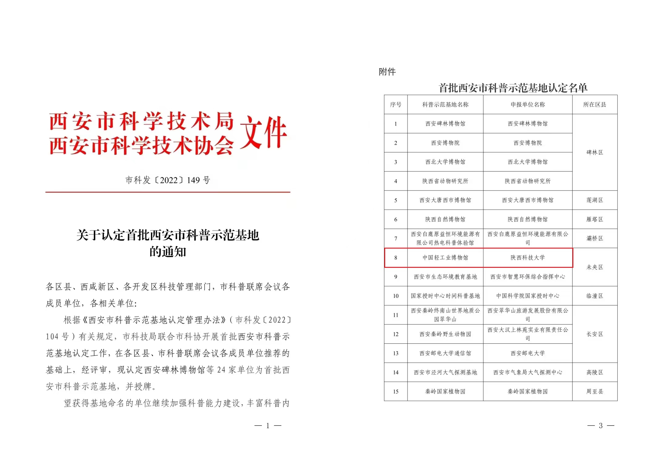 近日,西安市科學技術局、西安市科學技術協(xié)會發(fā)布《關于認定首批西安市科普示范基地的通知》,經(jīng)評審,認定24家單位為首批西安市科普示范基地。其中,包括中國輕工業(yè)博物館在內的三所高校博物館,入選首批西安市科普示范基地。