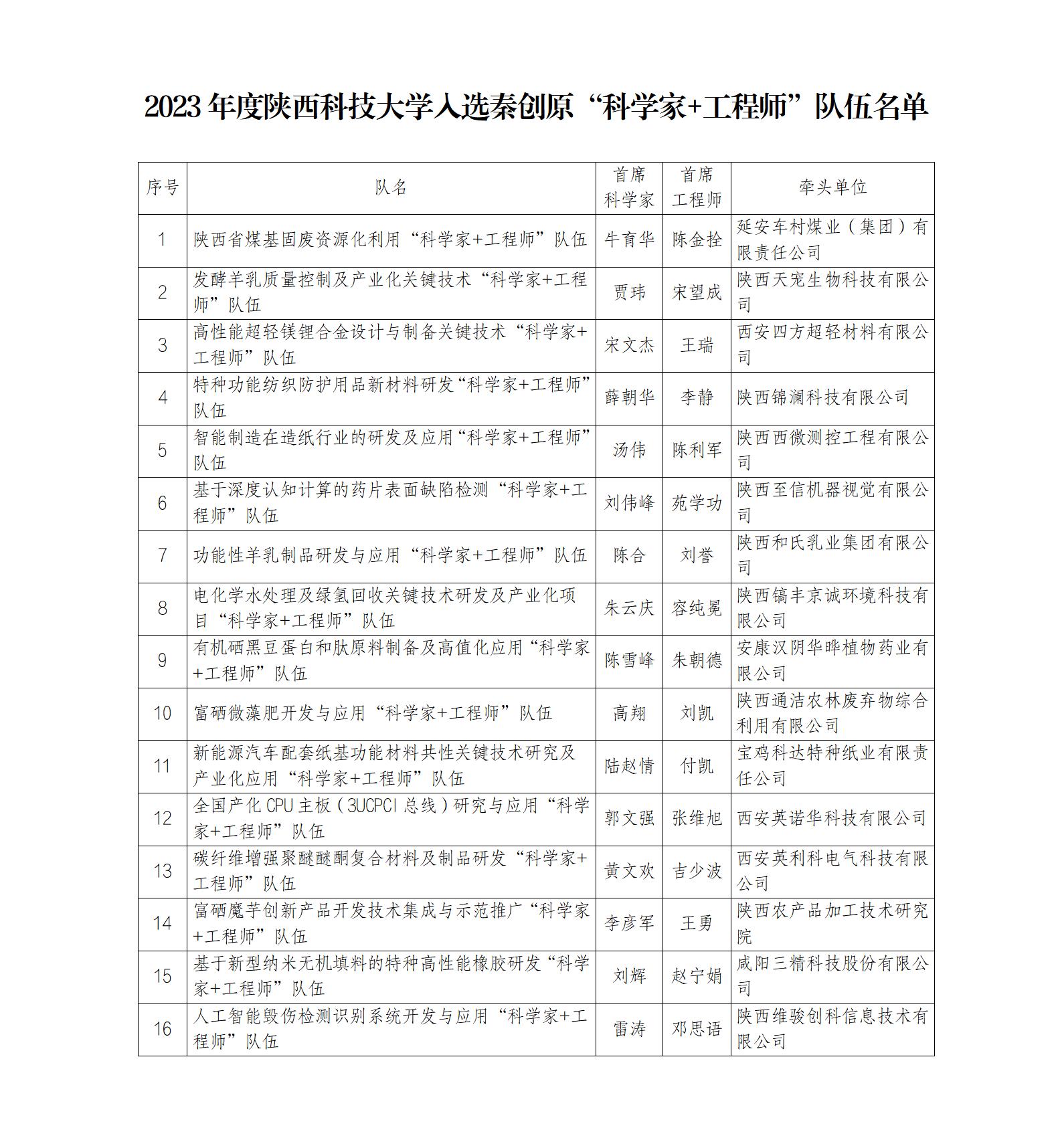 近日,陜西省科學技術廳公布了秦創(chuàng)原2023年度“科學家+工程師”隊伍入選名單。我校牛育華、賈瑋等16位教師科研團隊與企業(yè)深度合作,成功入選秦創(chuàng)原“科學家+工程師”隊伍。