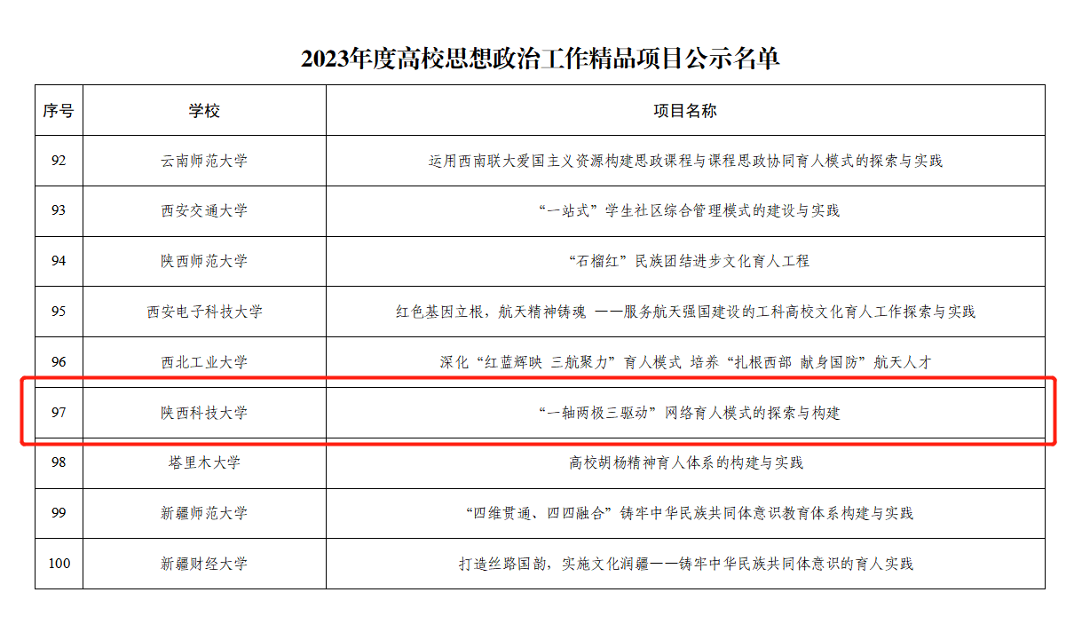 近日,教育部思想政治工作司公示了2023年度高校思想政治工作質(zhì)量提升綜合改革與精品建設(shè)項(xiàng)目遴選結(jié)果,我校黨委副書(shū)記郭強(qiáng)主持的網(wǎng)絡(luò)育人項(xiàng)目《“一軸兩極三驅(qū)動(dòng)”網(wǎng)絡(luò)育人模式的探索與構(gòu)建》成功入選高校思想政治工作精品項(xiàng)目(全國(guó)共100項(xiàng),網(wǎng)絡(luò)育人類(lèi)別全國(guó)僅5項(xiàng))。我校連續(xù)2年成為陜西省屬高校中唯一入選高校。