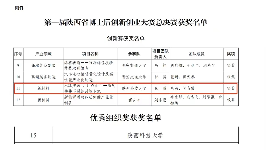 近日,由陜西省委組織部、省委教育工委、省人社廳及省教育廳聯(lián)合舉辦的第一屆陜西省創(chuàng)新創(chuàng)業(yè)大賽獲獎(jiǎng)名單公布,我校輕工科學(xué)與工程學(xué)院(柔性電子學(xué)院)師資博士后張雷的項(xiàng)目《水乳交融,油然而生—油氣井井下裂縫封堵專家》獲創(chuàng)新賽銀獎(jiǎng),學(xué)校榮獲優(yōu)秀組織獎(jiǎng)。