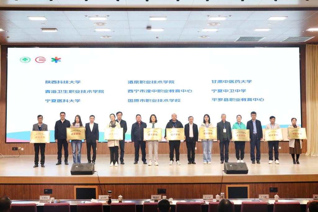 我校代表(左一)領(lǐng)取“全國學(xué)校急救教育試點(diǎn)學(xué)?!迸曝?/span>