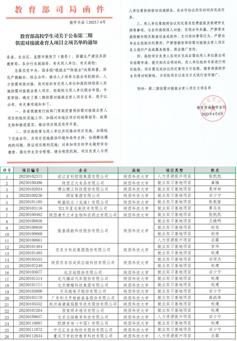近日,教育部發(fā)布了《教育部高校學(xué)生司關(guān)于公布第二期供需對(duì)接就業(yè)育人項(xiàng)目立項(xiàng)名單的通知》(教學(xué)司函〔2023〕6號(hào)),陜西科技大學(xué)與比亞迪股份有限公司、顧家集團(tuán)有限公司,隆基綠能科技股份有限公司、浙江吉利控股集團(tuán)有限公司、天馬微電子股份有限公司、杭州??低晹?shù)字技術(shù)有限公司、聯(lián)盛紙業(yè)(龍海)有限公司等21家單位合作的26個(gè)項(xiàng)目獲批立項(xiàng)。