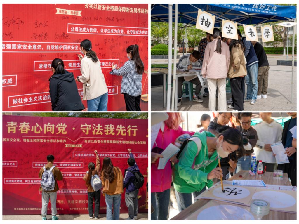2023年4月15日,是黨的二十大后的第一個(gè)、也是第八個(gè)全民國家安全教育日,為深入普及宣傳國家安全法律法規(guī),激發(fā)廣大師生的愛國熱情,樹牢總體國家安全觀。在校黨委宣傳部和網(wǎng)絡(luò)思想政治工作中心/易班發(fā)展中心的指導(dǎo)和大力支持下,電子信息與人工智能學(xué)院團(tuán)委、律述法芽網(wǎng)絡(luò)文化工作室聯(lián)合西安市公安局未央分局、陜西科技大學(xué)書法協(xié)會,在沁園廣場舉行“青春心向黨?守法我先行”主題系列普法活動(dòng)。