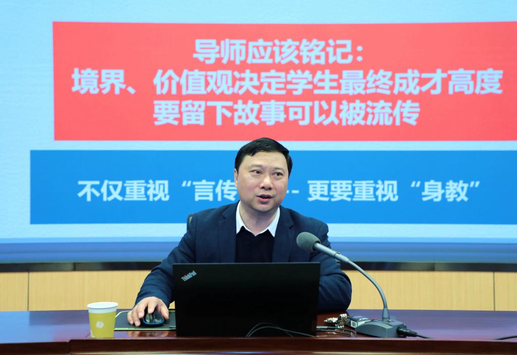 4月13日上午,賴紹聰作了題為《學(xué)高為師德高為范研究生導(dǎo)師的責(zé)任與義務(wù)》的主題報(bào)告。報(bào)告從導(dǎo)師的定義、嚴(yán)于律己德高為范、為人師表學(xué)高為師、創(chuàng)新機(jī)制科學(xué)育人四個(gè)方面,深入交流了研究生導(dǎo)師的責(zé)任與義務(wù),以及如何修煉內(nèi)功才能成為一名合格的導(dǎo)師。賴紹聰在報(bào)告中鼓勵(lì)各位新晉導(dǎo)師要懷有敬畏之心,主動(dòng)擔(dān)當(dāng),因材施教,創(chuàng)新方法,在不斷提高自身科學(xué)素質(zhì)、學(xué)術(shù)水平的同時(shí),鼓勵(lì)和引導(dǎo)研究生成長成才,勝任新時(shí)代賦予研究生導(dǎo)師的歷史使命。