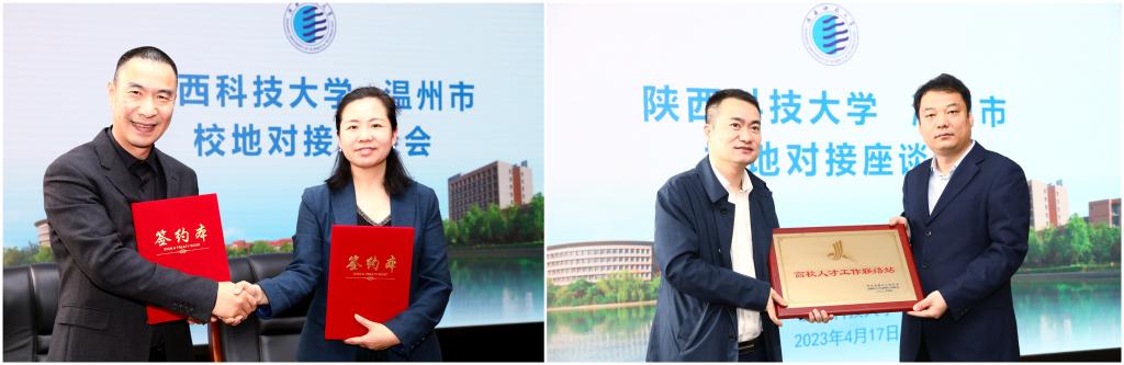會上,溫州市和我校簽訂“高校人才工作聯(lián)絡站”協(xié)議,并為我?!案咝H瞬殴ぷ髀?lián)絡站”授牌。