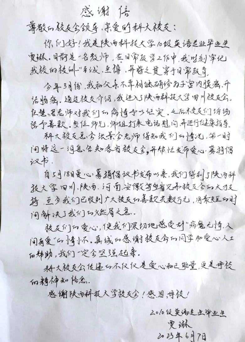 賈琳系我校文理學(xué)院英語專業(yè)14屆校友。畢業(yè)后在河南省南陽市西峽縣某鎮(zhèn)小學(xué)任教,夫婦二人均為人民教師。今年3月,賈琳和父親相繼罹患癌癥。一時(shí)間,巨大的精神壓力和經(jīng)濟(jì)壓力讓這個(gè)家庭陷入困境。校友總會(huì)得知這一情況后,第一時(shí)間聯(lián)系校友賈琳,了解病情,表達(dá)母校的關(guān)心和慰問。同時(shí),為幫助校友走出困境,本著關(guān)愛校友、幫助校友的原則,校友總會(huì)聯(lián)合四川校友會(huì)、陜西校友會(huì)、河南校友會(huì)向廣大校友們發(fā)出倡議,希望大家能夠在力所能及范圍內(nèi)向賈琳及其家庭伸出援手。文理學(xué)院隨即在學(xué)院群、專業(yè)群和班級(jí)群發(fā)出捐款倡議,號(hào)召學(xué)院老師和校友向賈琳表達(dá)關(guān)愛之情。校友們紛紛慷慨解囊,奉獻(xiàn)愛心。還有校友主動(dòng)聯(lián)系校友總會(huì),表示愿意幫助聯(lián)系手術(shù)相關(guān)事宜。短短半月時(shí)間,校友總會(huì)、文理學(xué)院和全國各地的校友們?yōu)橘Z琳籌款5萬余元,讓這個(gè)家庭堅(jiān)定了抗擊病魔的信心。