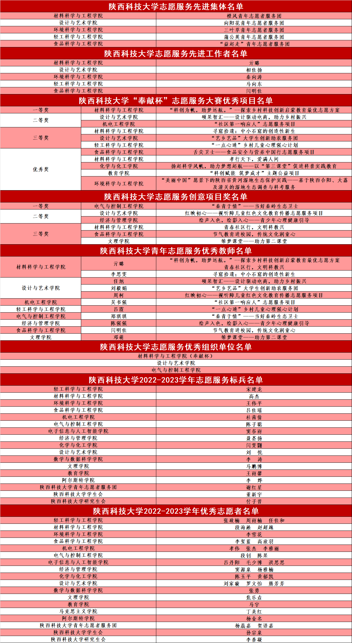 本次大賽的主題是“學(xué)習(xí)二十大 永遠跟黨走 青春志愿行”,在第一屆的基礎(chǔ)上,本次大賽新增創(chuàng)新志愿服務(wù)項目賽道,旨在大力宣傳志愿服務(wù)的創(chuàng)新精神,豐富競賽形式和內(nèi)容,激發(fā)學(xué)子創(chuàng)新創(chuàng)造動能。自今年3月份啟動以來,各學(xué)院團委積極響應(yīng),廣大志愿服務(wù)團隊和志愿者踴躍參與,通過自主申報、學(xué)院推薦的方式,共有95個項目和400余名志愿者報名參與。通過學(xué)院推報、資質(zhì)審查、書評評審、路演答辯等環(huán)節(jié),共評選出志愿服務(wù)先進集體5個,志愿服務(wù)先進工作者5名;項目部分共評選出優(yōu)秀項目11個,創(chuàng)新項目獎6個,青年志愿服務(wù)優(yōu)秀教師11名,其中,優(yōu)秀項目賽道評選出一等獎1名,二等獎2名,三等獎3名,優(yōu)秀獎5名,創(chuàng)新項目賽道評選出一等獎1名,二等獎2名,三等獎3名;個人部分評選出志愿服務(wù)標兵17名,優(yōu)秀志愿者32名。最終,材料科學(xué)與工程學(xué)院捧得“奉獻杯”,設(shè)計與藝術(shù)學(xué)院、電氣與控制工程學(xué)院一同獲評“陜西科技大學(xué)志愿服務(wù)優(yōu)秀組織單位”。