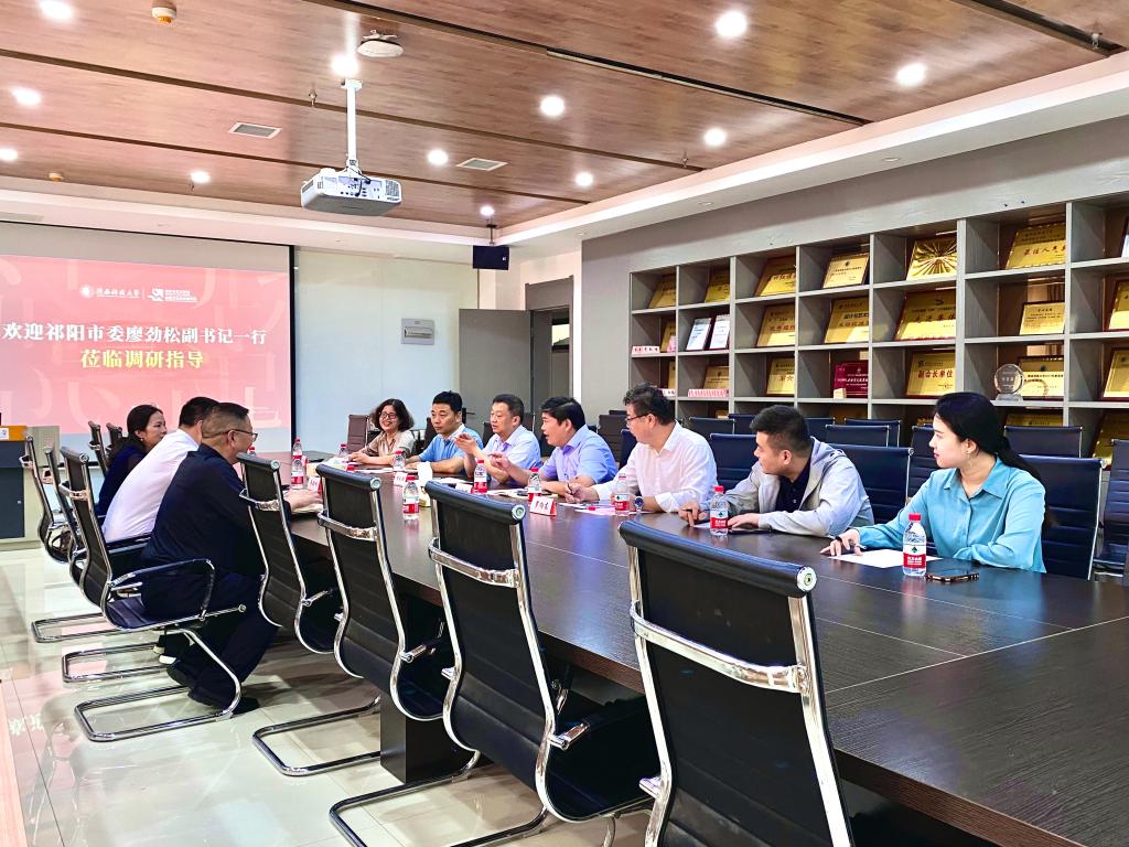 黃劍鋒對(duì)廖勁松一行來(lái)訪(fǎng)表示熱烈歡迎,并介紹了陜西科技大學(xué)的歷史沿革、特色優(yōu)勢(shì)、社會(huì)服務(wù)以及各學(xué)院在人才培養(yǎng)方面取得的成效,希望雙方在科研成果轉(zhuǎn)化、技術(shù)服務(wù)以及人才就業(yè)等多方面展開(kāi)多方合作。廖勁松從“十個(gè)好”介紹了祁陽(yáng)市的地理優(yōu)勢(shì)、歷史人文以及特色服務(wù)產(chǎn)業(yè),并希望借助我??蒲衅脚_(tái)及項(xiàng)目成果為當(dāng)?shù)禺a(chǎn)業(yè)提供技術(shù)與人才支持。