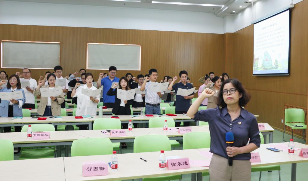 全體新入職教師在我校2023年度“誠(chéng)博”師德標(biāo)兵賀雪梅老師的帶領(lǐng)下進(jìn)行莊嚴(yán)宣誓,用激昂高亢的聲音喊出心中最堅(jiān)定的誓言。我宣誓:我立志做一名光榮的人民教師,忠誠(chéng)黨的教育事業(yè),嚴(yán)守憲法和法律法規(guī),遵守學(xué)校章程,履行教師職責(zé),珍惜教師聲譽(yù),弘揚(yáng)高尚師德,潛心立德樹(shù)人,秉承“三創(chuàng)兩遷”精神,恪守“至誠(chéng)至博”校訓(xùn),做有理想信念、有道德情操、有扎實(shí)學(xué)識(shí)、有仁愛(ài)之心的好老師,為建設(shè)特色鮮明的高水平教學(xué)研究型大學(xué)努力奮斗!鏗鏘有力的誓詞,堅(jiān)定有力的眼神,表達(dá)了我校青年教師不忘初心使命、牢記立德樹(shù)人的堅(jiān)定理想和永恒追求。
