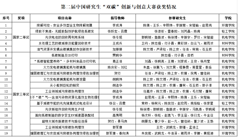 10月底,由教育部學(xué)位管理與研究生教育司指導(dǎo)、中國學(xué)位與研究生教育學(xué)會和中國科協(xié)青少年科技中心聯(lián)合主辦的第二屆中國研究生“雙碳”創(chuàng)新與創(chuàng)意大賽決賽在東北林業(yè)大學(xué)舉行。我校參賽隊(duì)伍經(jīng)過激烈角逐,最終有19項(xiàng)作品獲獎,其中5項(xiàng)作品獲全國二等獎,14項(xiàng)作品獲全國三等獎,我校榮獲全國高校優(yōu)秀組織單位獎。