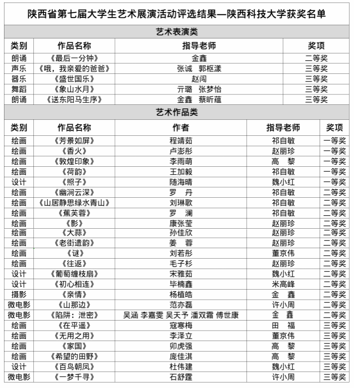 近日,由陜西省教育廳主辦的全省第七屆大學(xué)生藝術(shù)展演活動(dòng)圓滿落下帷幕。我校學(xué)子在本屆賽事中共斬獲29項(xiàng)獎(jiǎng)項(xiàng),取得歷史最好成績(jī),充分展現(xiàn)了學(xué)生的藝術(shù)修養(yǎng)和學(xué)校的美育成果。