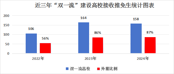 積極拓寬推薦本校優(yōu)秀本科生到“雙一流”建設(shè)高校免試攻讀碩士學(xué)位工作。2024年“雙一流”建設(shè)高校推薦人數(shù)占全校普通推免計(jì)劃的87%。2024年學(xué)校有158名優(yōu)秀應(yīng)屆本科畢業(yè)生被推薦到“雙一流”建設(shè)高校攻讀研究生(含直博生5名),學(xué)校推免生校外推薦比例和高校質(zhì)量不斷提升。