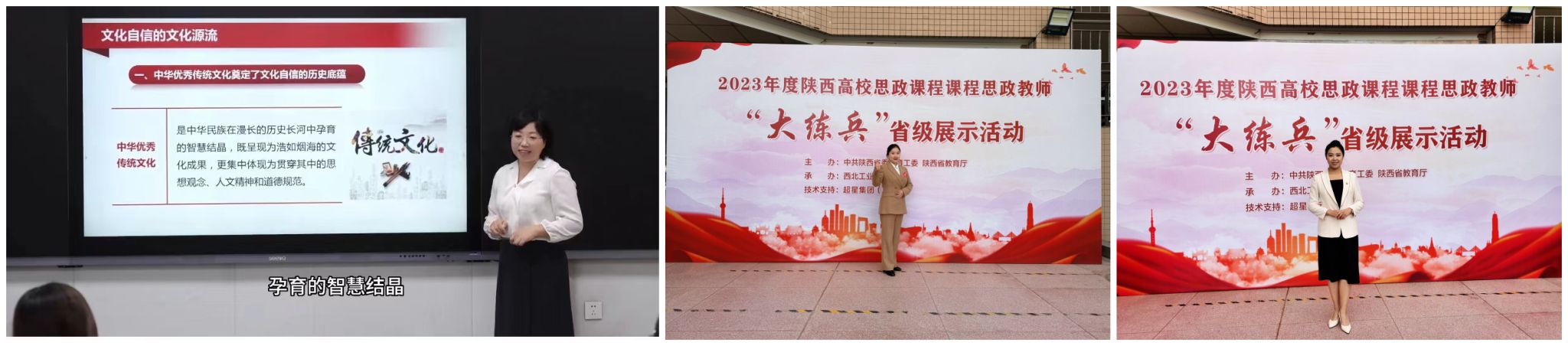 2023年度陜西高校思政課程、課程思政教師“大練兵”活動(dòng)通過(guò)校級(jí)選拔、省級(jí)網(wǎng)絡(luò)評(píng)審、現(xiàn)場(chǎng)展示、專家提問(wèn)等環(huán)節(jié)進(jìn)行了省級(jí)評(píng)選;現(xiàn)場(chǎng)展示同時(shí)向全省高校開(kāi)通線上直播。在活動(dòng)中,我校教師充分展示了鮮明的政治立場(chǎng)、扎實(shí)的學(xué)術(shù)理論功底、精湛的教學(xué)藝術(shù)。在主題選取、課程導(dǎo)入、案例選擇、內(nèi)容設(shè)置、課件設(shè)計(jì)、學(xué)理支撐等方面都有著優(yōu)異的表現(xiàn),展示了我校教師隊(duì)伍良好的教學(xué)能力和自信的精神面貌。