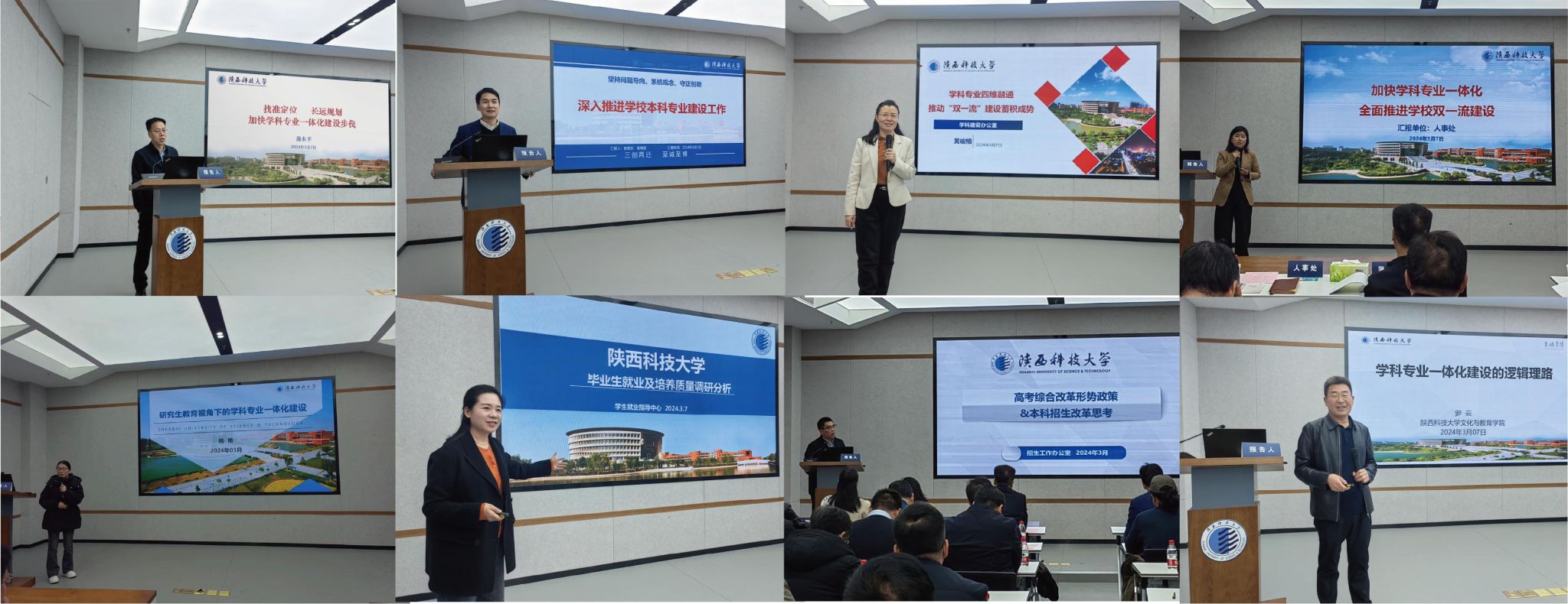 教務(wù)處、學(xué)科辦、人事處、研究生院、學(xué)工部、招生辦、文教學(xué)院負(fù)責(zé)同志分別基于前期調(diào)研分析結(jié)果及我校學(xué)科發(fā)展現(xiàn)狀做專(zhuān)題報(bào)告。報(bào)告人梳理亮點(diǎn)、剖析不足、規(guī)劃路徑、明確重點(diǎn),圍繞深入推進(jìn)本科專(zhuān)業(yè)建設(shè)工作、學(xué)科專(zhuān)業(yè)四維融通、學(xué)科專(zhuān)業(yè)一體化建設(shè)視域下師資隊(duì)伍建設(shè)、研究生教育視角下的學(xué)科專(zhuān)業(yè)一體化建設(shè)、畢業(yè)生就業(yè)與培養(yǎng)質(zhì)量調(diào)研分析、高考綜合改革形勢(shì)與學(xué)校本科招生改革、學(xué)科專(zhuān)業(yè)一體化建設(shè)的邏輯理路等方面內(nèi)容進(jìn)行匯報(bào)。