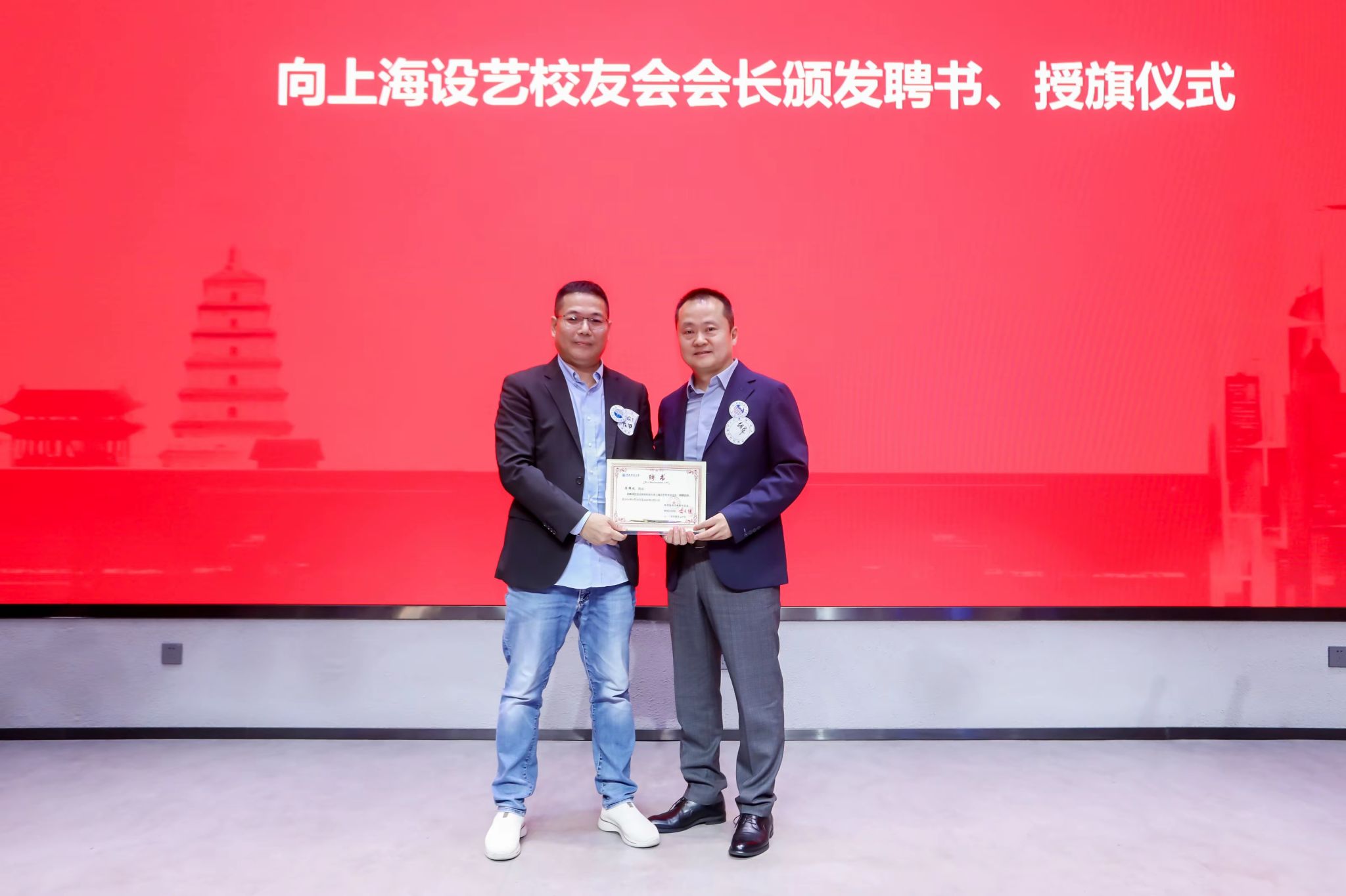 李學軍為上海設藝校友會會長陳錦枝頒發(fā)聘書。陳錦枝為上海設藝校友會常務副會長、副會長、秘書長、副秘書長頒發(fā)聘書。