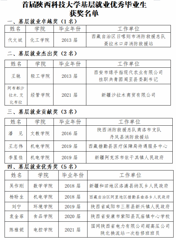 為積極響應(yīng)國家鼓勵高校畢業(yè)生到西部、到基層就業(yè)創(chuàng)業(yè)戰(zhàn)略,進(jìn)一步優(yōu)化學(xué)校人才培養(yǎng)結(jié)構(gòu),教育和引導(dǎo)畢業(yè)生樹立扎根基層、服務(wù)西部的就業(yè)觀和擇業(yè)觀,我校于本學(xué)期啟動“陜西科技大學(xué)首屆基層就業(yè)優(yōu)秀畢業(yè)生評選活動”。4月26日,該項活動評選及公示環(huán)節(jié)正式結(jié)束,共評選出以化學(xué)與化工學(xué)院2013屆畢業(yè)生代文斌、輕工科學(xué)與工程學(xué)院(柔性電子學(xué)院)2013屆畢業(yè)生王馳、經(jīng)濟與管理學(xué)院(亞歐貿(mào)易與數(shù)字經(jīng)濟學(xué)院)2021屆畢業(yè)生阿布都沙拉木.艾比布拉等為代表的11名基層就業(yè)優(yōu)秀畢業(yè)生。