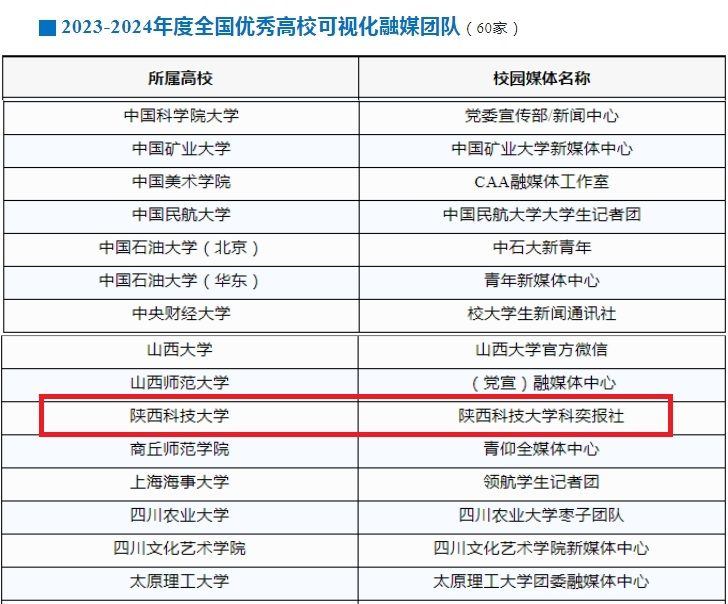 近日,由中國青年報社、中青校媒主辦的“2023-2024尋找高??梢暬诿綀F(tuán)隊”評選活動結(jié)果揭曉,陜西科技大學(xué)科奕報社榮獲“2023-2024年度全國優(yōu)秀高??梢暬诿綀F(tuán)隊”稱號(全國60家)。