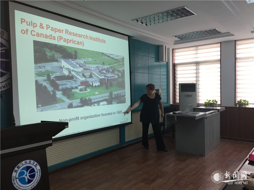 米歇爾·瑞米德作了題為“加拿大林產(chǎn)品創(chuàng)新研究院的簡介和研究動態(tài)”的學(xué)術(shù)報告。她首先簡單介紹了加拿大紙漿和造紙研究所及加拿大森林產(chǎn)品創(chuàng)新工業(yè)研究院。緊接著介紹其研究院從森林到市場的整個鏈、其獨特靈活的商業(yè)模式、研究院上游部門等,當(dāng)米歇爾·瑞米德講到木材建造多層建筑及道路橋梁等的新的解決方案時,引起全體師生的極大興趣。隨后詳細講解纖維素納米晶體、纖維素纖絲和木素產(chǎn)品的工業(yè)應(yīng)用以及生物質(zhì)品和環(huán)境服務(wù)的關(guān)系等,讓我們看到了紙漿和造紙未來更大的發(fā)展和應(yīng)用前景。