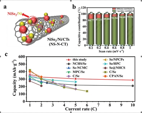 (a)NiSe2/Ni/CT的結(jié)構(gòu)示意圖;(b) 不同掃描速率下Se@NiSe2/Ni/CTs電極電容容量的歸一化貢獻率;(c) Se@NiSe2/Ni/CTs與其他報道的Na-Se電池材料的比較。