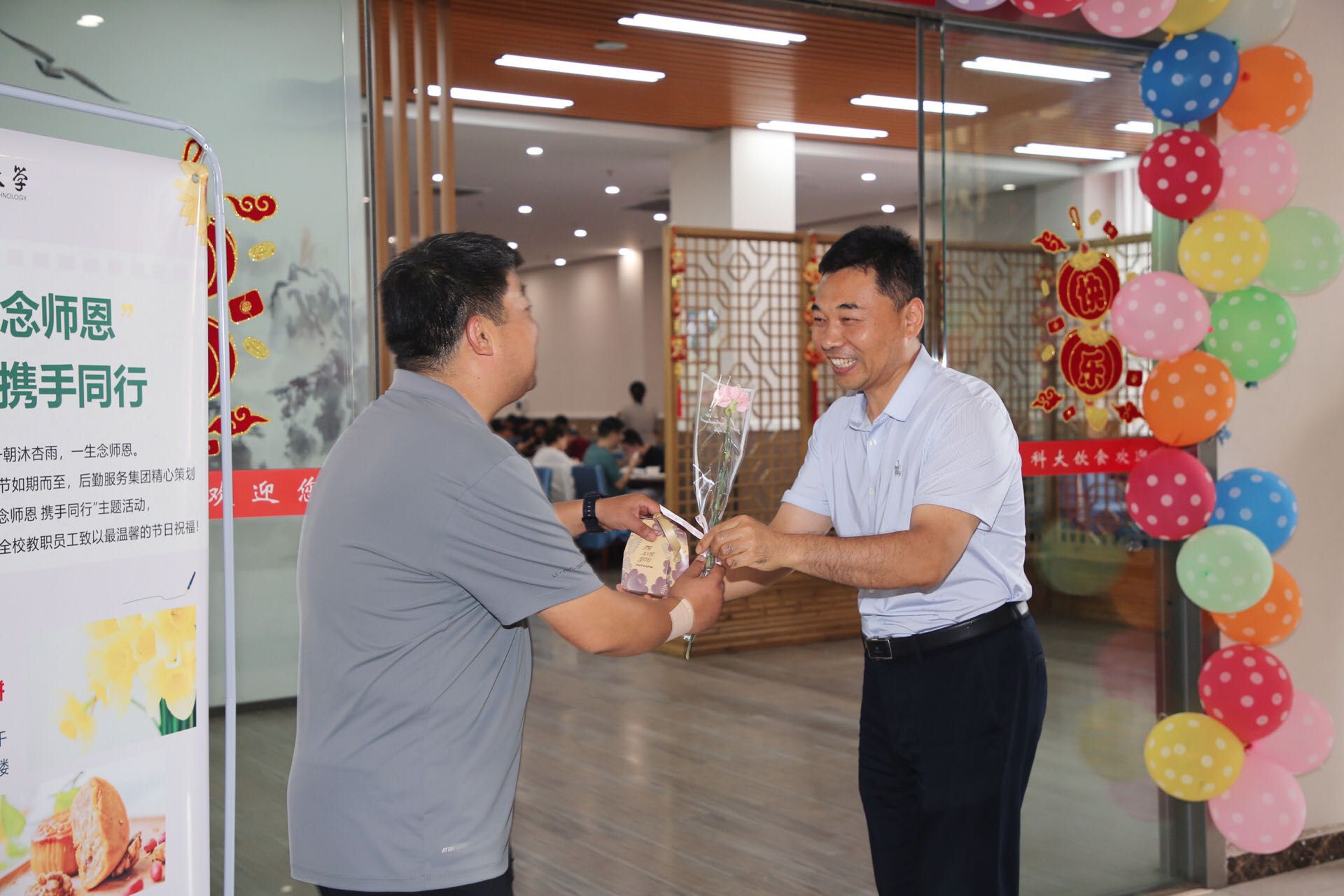 清晨,當第一縷陽光灑滿校園,后勤集團的工作人員便忙碌起來,他們手捧一朵朵精心挑選、色彩斑斕的鮮花和新鮮出爐的月餅,將這份特別的禮物送到每一位前來就餐的老師手中。