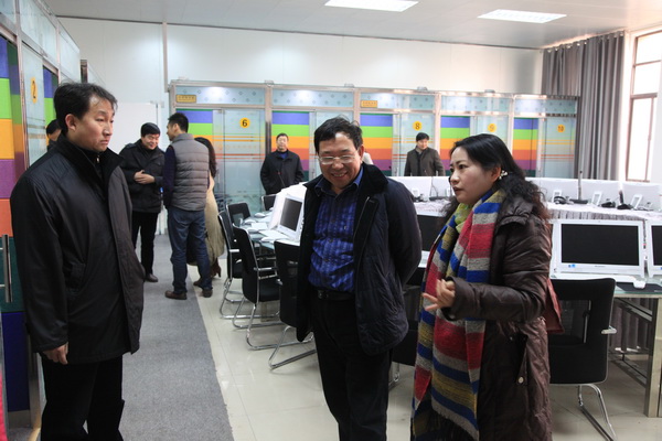 省教育廳語言文字工作處副處長劉白燕(右一)在副校長姚書志(右二)等陪同下在我校計算機(jī)輔助普通話水平測試站現(xiàn)場考察