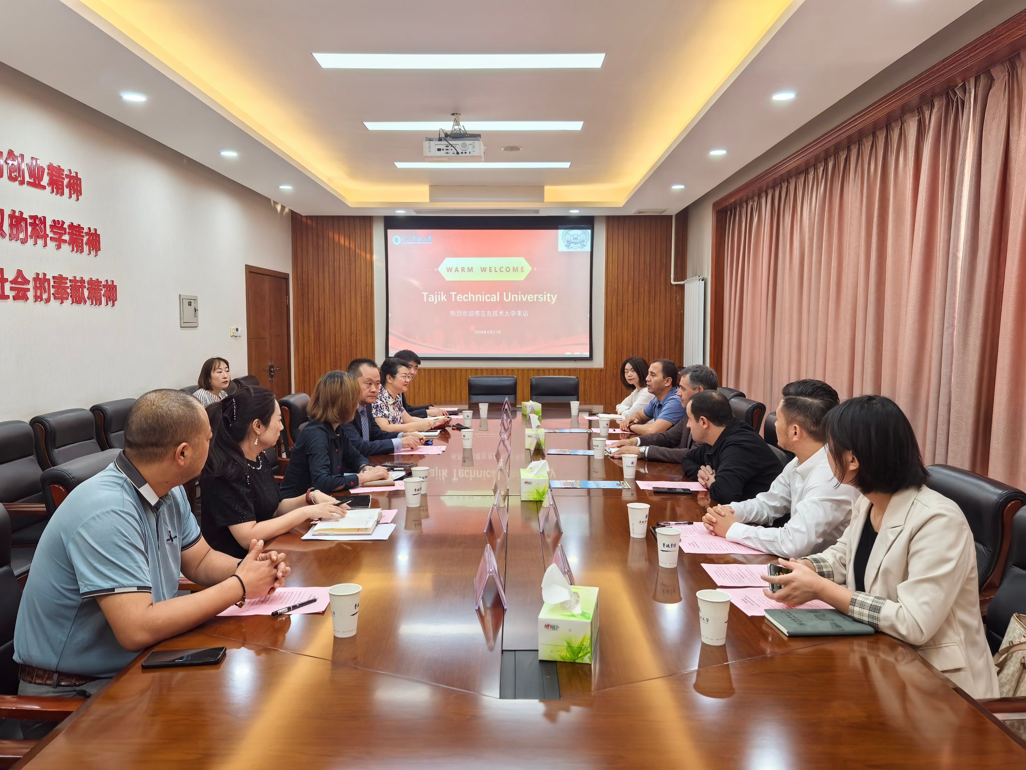 2024年9月27日上午,塔吉克斯坦技術(shù)大學(xué)納茲爾·瓦茲洛夫副校長一行3人和我校校友西安精景慧城公司總經(jīng)理張愈及校友會秘書長唐秸一行5人來我校訪問。副書記李學(xué)軍出席座談會,國際合作與交流處處長張素風(fēng)主持。