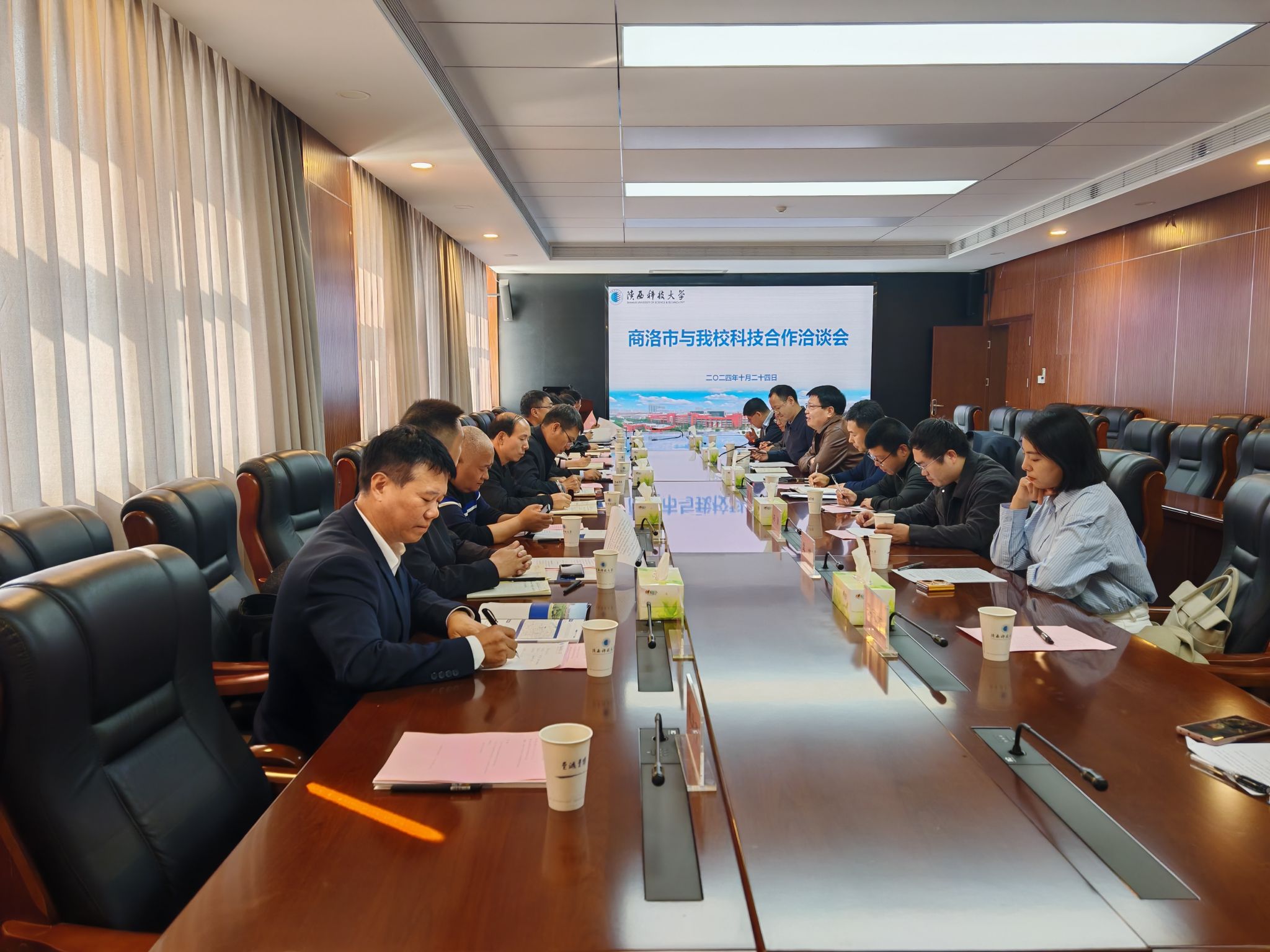 為貫徹落實我校第三次黨代會精神,深入實施服務社會創(chuàng)優(yōu)行動,促進產學研開放合作,經(jīng)前期充分溝通,10月24日下午,商洛市科技局黨組書記、局長楊博,丹鳳縣科經(jīng)局黨組書記、局長付學華,山陽縣科經(jīng)局黨組書記、局長陳德軍及部分企業(yè)家代表一行15人來我校洽談科技成果轉化。我校副校長陸趙情出席并講話,前沿科學與技術轉移研究院相關負責人,輕工科學與工程學院、食品科學與工程學院、電氣與控制工程學院、設計與藝術學院相關專家教授出席了洽談會。會議由前沿院常務副院長強濤濤主持。