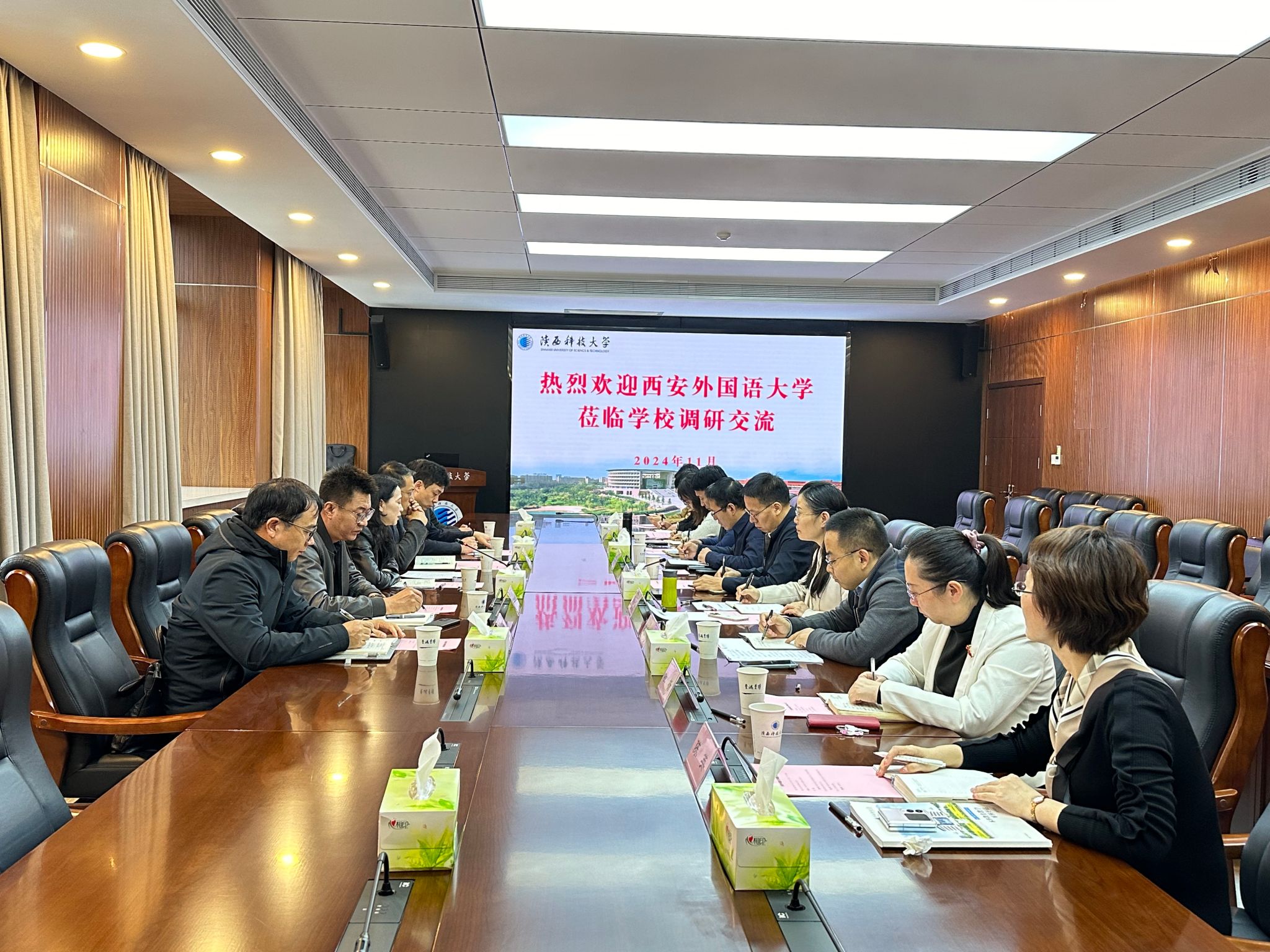 11月15日下午,西安外國(guó)語(yǔ)大學(xué)黨委副書記馬潔一行來(lái)校調(diào)研交流,座談會(huì)由副校長(zhǎng)蒲永平主持。黨校辦、宣傳部、學(xué)工部、校團(tuán)委、學(xué)科辦、教務(wù)處、文教學(xué)院、體育部等相關(guān)單位負(fù)責(zé)人參加座談。