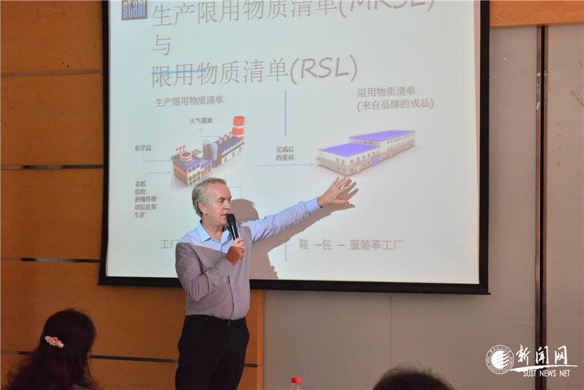 座談會后,邁克爾?科斯特洛為皮革專業(yè)學生做了題為《可持續(xù)發(fā)展與機遇》的報告。邁克爾?科斯特洛專業(yè)而嚴謹?shù)男袠I(yè)分析給在場學生留下深刻的印象,報告會現(xiàn)場互動熱烈,掌聲不斷。