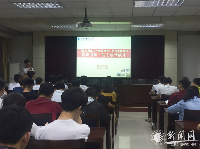 召開思政主題報告會,專項工作聯(lián)動育人。為了將學校思政工作會議精神化作立德樹人的實效,機電學院推出系列主題報告會,活動以與學生在校學習生活密切相關(guān)的內(nèi)容為主旨,凝練方向,將相繼開展職業(yè)引領(lǐng)、專業(yè)引領(lǐng)、育心引領(lǐng)、思想引領(lǐng)、榜樣引領(lǐng)等五大主題報告,幫助學生廓清大學學習生活中的認識、化解日常學習生活中的困難、祛除青年成長發(fā)展中的煩惱,助力學生成長成才,努力實現(xiàn)思政育人的最終目標。4月26日舉行了活動啟動儀式暨首場報告會,邀請學校就業(yè)指導中心就業(yè)創(chuàng)業(yè)部主任羅曉婷作了《大學是道選擇題——大學生的出路》主題報告,2017級各專業(yè)300余名學生參加。報告會圍繞大學生職業(yè)生涯規(guī)劃要素與階段,通過深入淺出地講解,強調(diào)“生涯之道在于應(yīng)變之道”,引導學生志存高遠、腳踏實地。5月1日,面向部分預(yù)備黨員、2016和2017級全體班長,邀請優(yōu)秀學生黨員代表作了《榜樣引領(lǐng)·助力成長成才》主題報告,報告人圍繞自身學習生活實際、如何立足崗位做奉獻進行了交流。