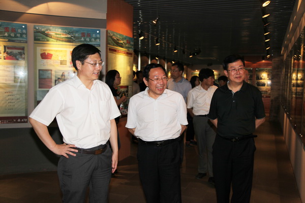 校長姚書志(右二)在延安大學(xué)校長張金鎖(左一)和黨委副書記田伏虎的陪同下參觀延安大學(xué)校史館