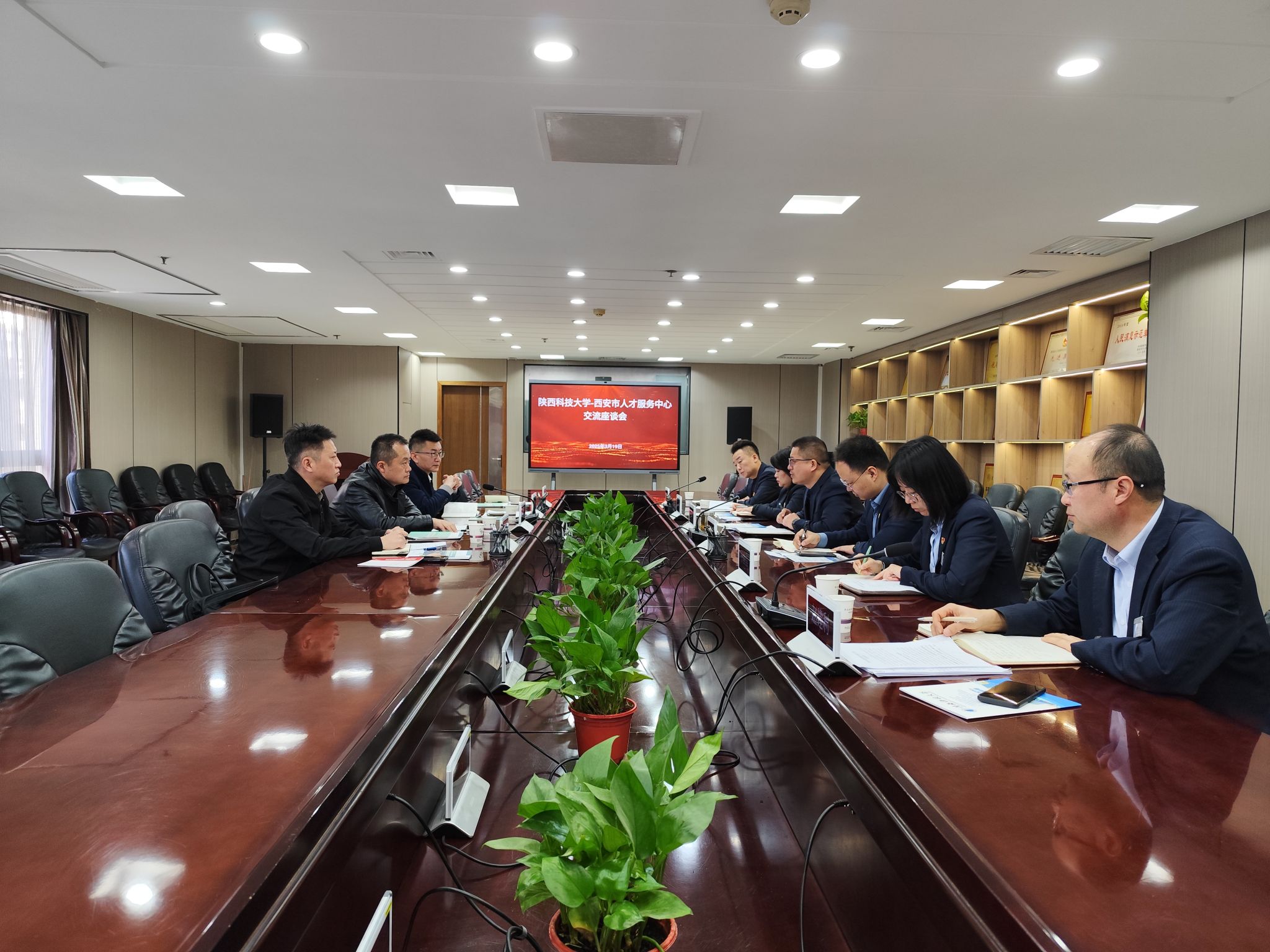 在陜西省人才交流服務(wù)中心座談會上,李學(xué)軍對省人才長期以來對我校就業(yè)工作的支持表示感謝,并簡要介紹了學(xué)校的辦學(xué)歷史、人才培養(yǎng)以及2025屆畢業(yè)生基本情況。他表示,陜西省人才服務(wù)中心在整合企業(yè)資源方面具有顯著優(yōu)勢,誠邀到學(xué)校開展招聘活動,為畢業(yè)生提供更多優(yōu)質(zhì)就業(yè)機(jī)會。陜西省人才交流服務(wù)中心主任梅曉剛對李學(xué)軍一行的到來表示歡迎,并詳細(xì)介紹了今年春季以來人社部門在畢業(yè)生就業(yè)方面開展的工作,特別是近期啟動的大中城市聯(lián)合招聘活動。他指出,即將舉辦的“樂業(yè)陜西 ‘就’在三秦 職引未來·全國城市聯(lián)合招聘高校畢業(yè)生雙選會”將與陜西科技大學(xué)緊密合作,為畢業(yè)生提供精準(zhǔn)化、高質(zhì)量的就業(yè)服務(wù)。