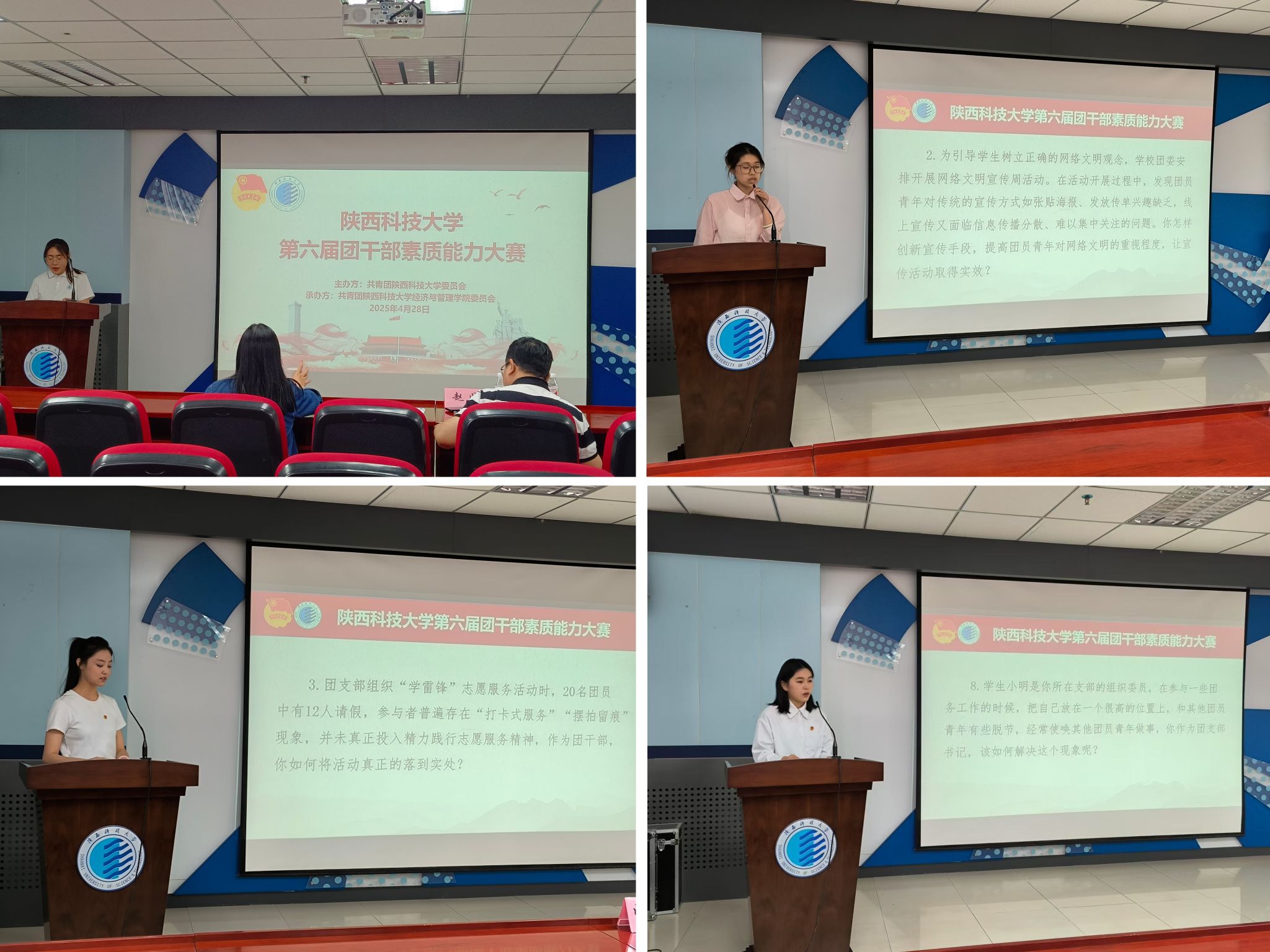 本次大賽歷時(shí)一個(gè)月,分為初賽、復(fù)賽、決賽三個(gè)環(huán)節(jié)。經(jīng)校團(tuán)委與各學(xué)院選拔推薦,校團(tuán)委科級(jí)干部、各二級(jí)學(xué)院團(tuán)委書記(副書記)、學(xué)生團(tuán)干共52人進(jìn)入校級(jí)比賽環(huán)節(jié)。本次比賽重點(diǎn)考查團(tuán)干部對(duì)黨團(tuán)理論知識(shí)及上級(jí)、學(xué)校重要文件精神的學(xué)習(xí)、宣傳、闡釋能力。