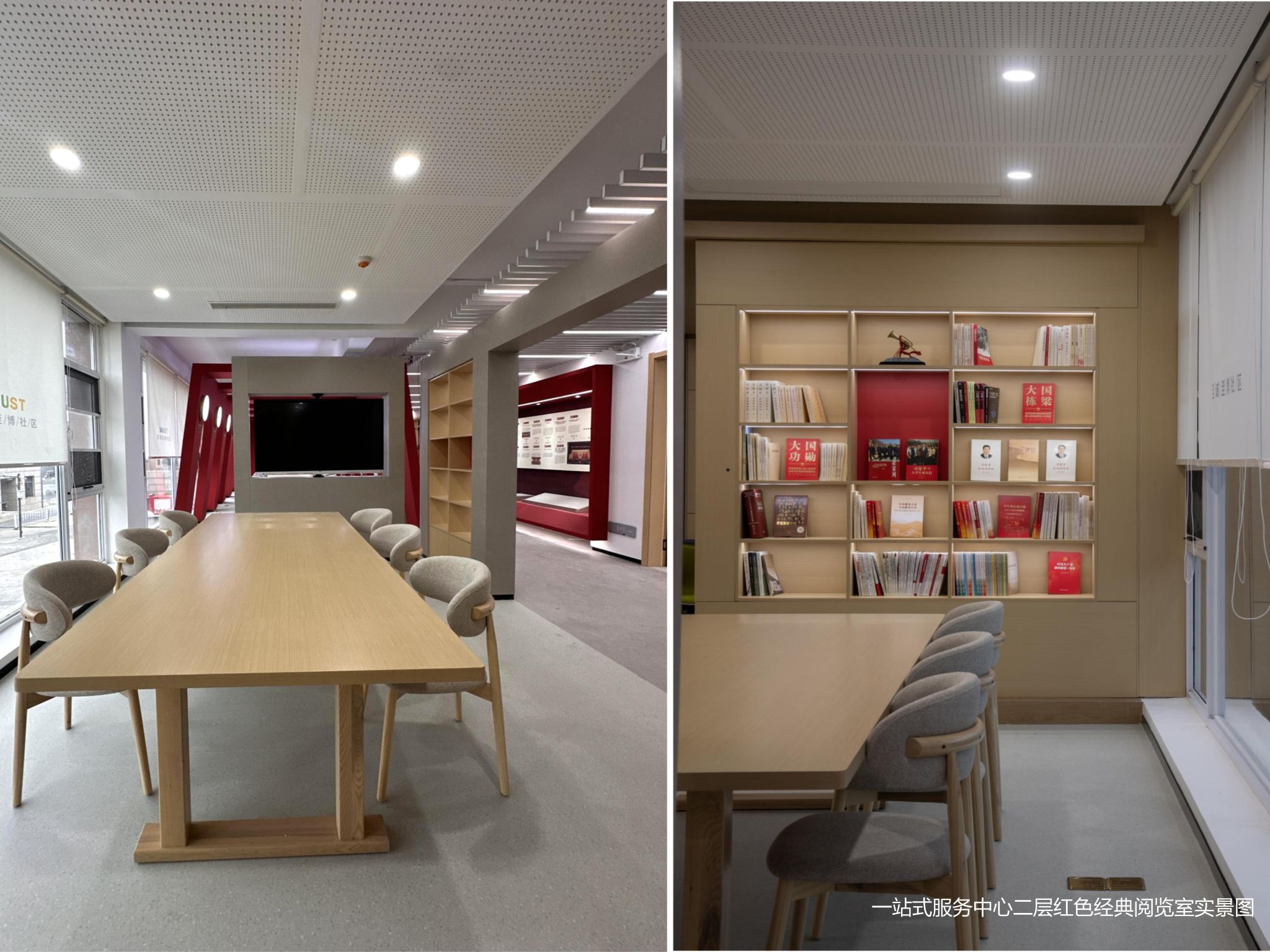 中心注重突出黨建引領(lǐng)的思政育人功能,在二樓建成了黨員之家、紅色經(jīng)典閱覽室、輔導(dǎo)員之家和若干黨團(tuán)班活動(dòng)室。黨員之家以窯洞為造型,寓意傳承和弘揚(yáng)延安精神,迎面懸掛黨旗、鐫刻入黨誓詞,立柱展示中國(guó)共產(chǎn)黨人精神譜系的偉大精神,沉浸式環(huán)境涵養(yǎng)紅色基因;輔導(dǎo)員之家將系統(tǒng)展示我校輔導(dǎo)員隊(duì)伍建設(shè)的思路、成果及成效,服務(wù)我校輔導(dǎo)員隊(duì)伍研學(xué)研討,推動(dòng)隊(duì)伍職業(yè)化專業(yè)化發(fā)展;紅色經(jīng)典閱覽室配備系列黨的歷史與黨建方面書(shū)籍,服務(wù)廣大黨員閱讀研討紅色經(jīng)典;輔導(dǎo)員之家、紅色經(jīng)典閱覽室、黨員之家空間聯(lián)通,充分體現(xiàn)了思想政治工作學(xué)與做、教與學(xué)的知行合一與育人主旨;黨團(tuán)班活動(dòng)室設(shè)有兩個(gè),一個(gè)可容納70余人共同使用,并可以隨時(shí)關(guān)閉隔離門分割為兩個(gè)互不干擾的獨(dú)立活動(dòng)室使用,另一個(gè)可容納近60人共同使用,全部配備自由移動(dòng)桌椅和電子屏幕,為學(xué)生黨支部、團(tuán)支部及班級(jí)活動(dòng)開(kāi)展提供可容納不同人數(shù)的空間場(chǎng)地和賦能增效的現(xiàn)代化設(shè)施支持,服務(wù)黨團(tuán)班探索開(kāi)展高質(zhì)量、沉浸式、互動(dòng)性集體活動(dòng)。